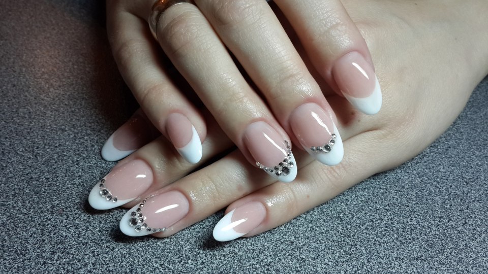 Дизайн ногтей миндаль френч белый со стразами (75 фото)
