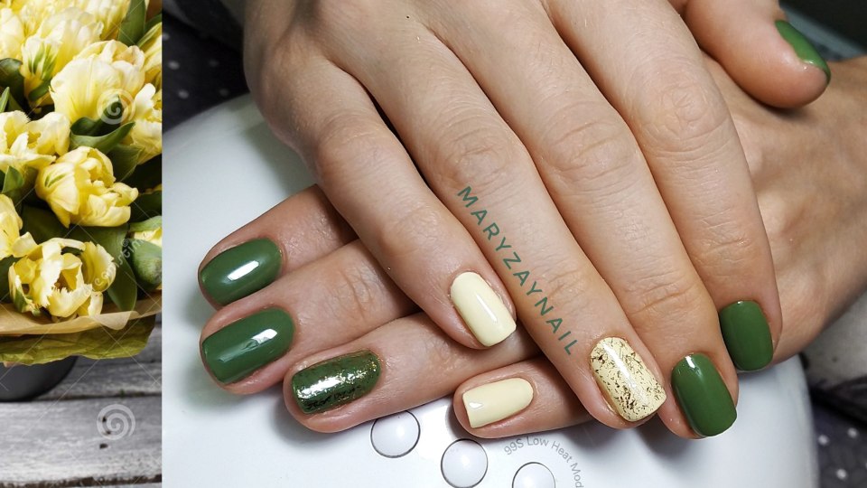Маникюр болотного цвета с фольгой