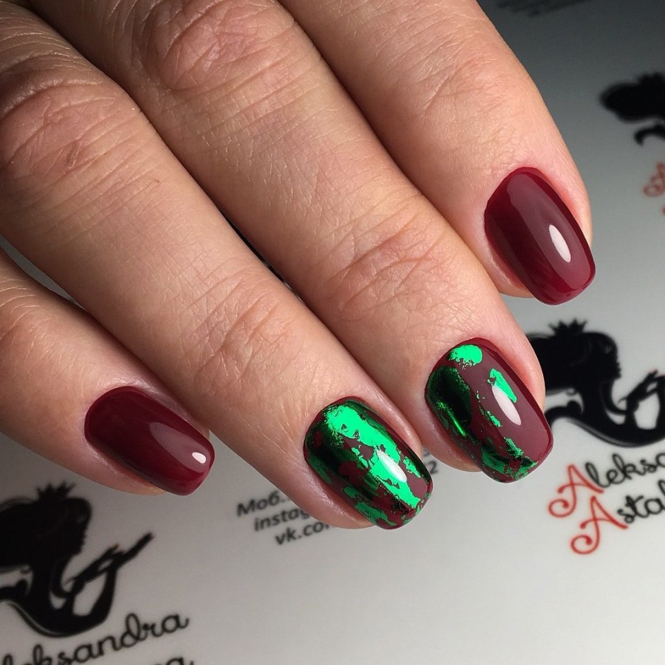 Маникюр красная и зеленая фольга