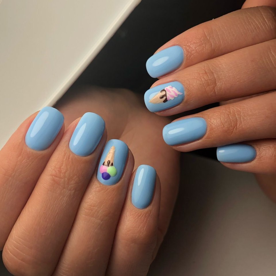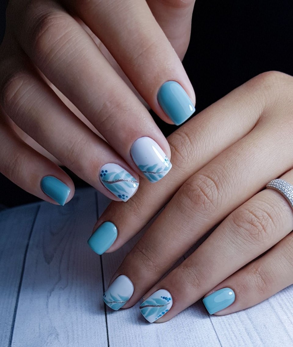 Маникюр на короткие ногти голубого цвета с рисунком (77 фото)