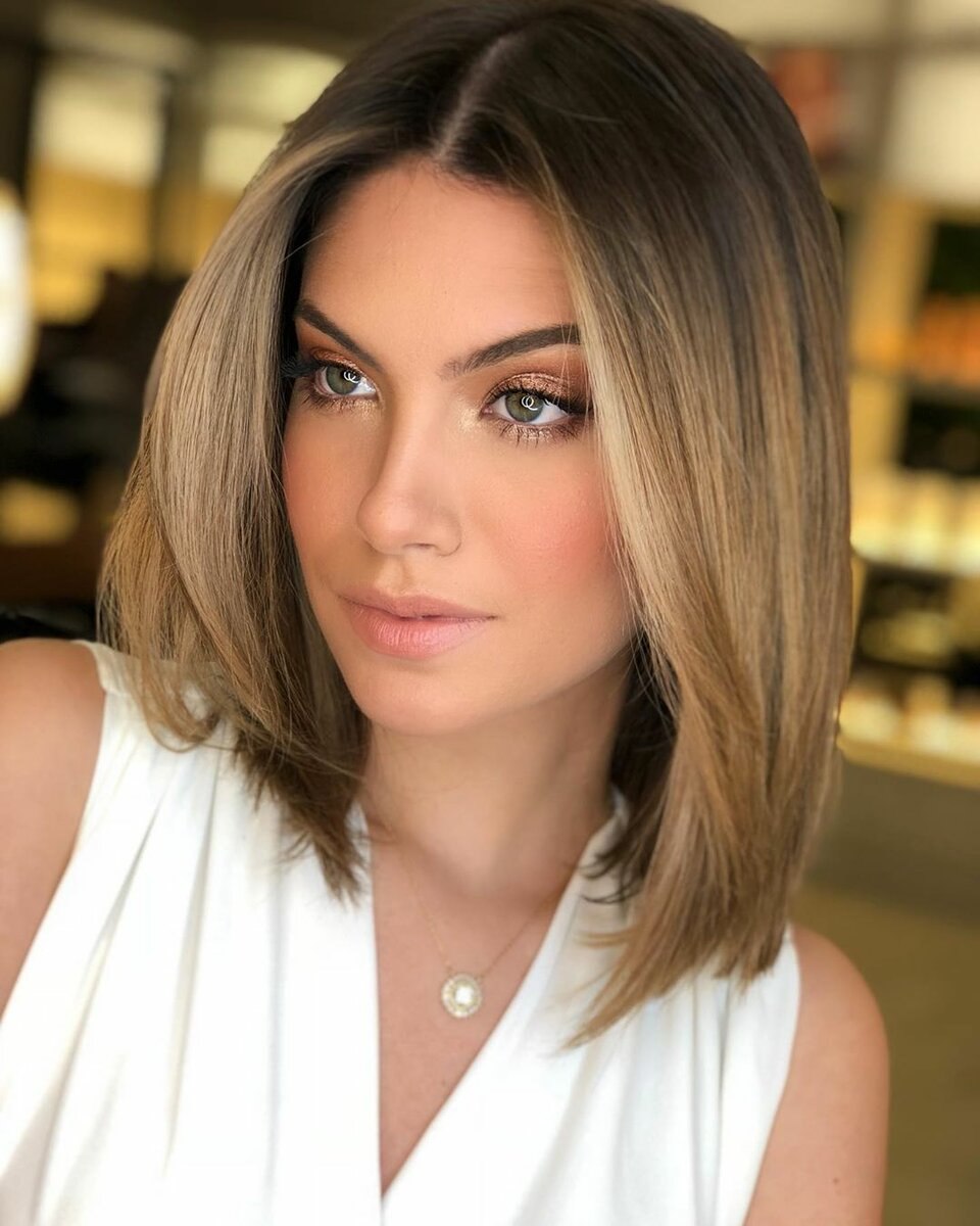 Стрижка удлиненный Боб на средние волосы без челки для круглого лица