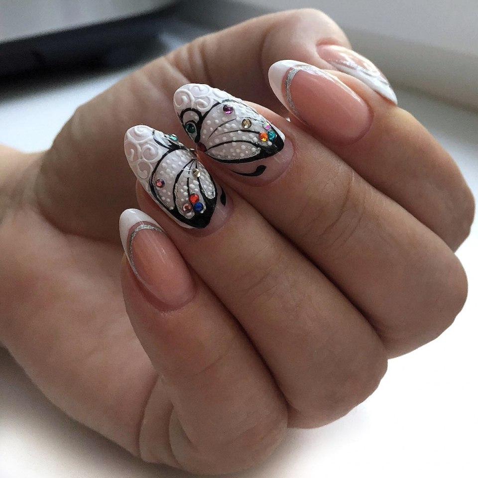 Френч маникюр миндаль с бабочками