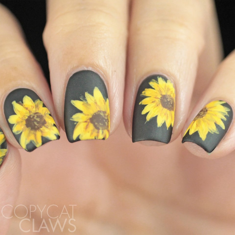 Черный маникюр с подсолнухами