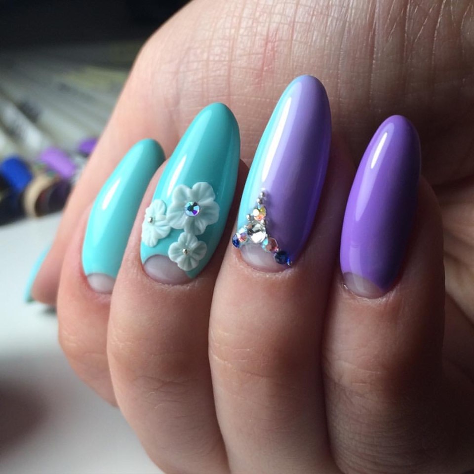 Маникюр бирюзовый с сиреневым