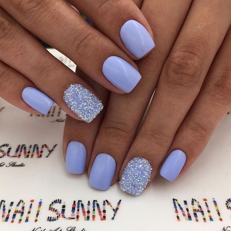 Маникюр голубой с сиреневым и стразами
