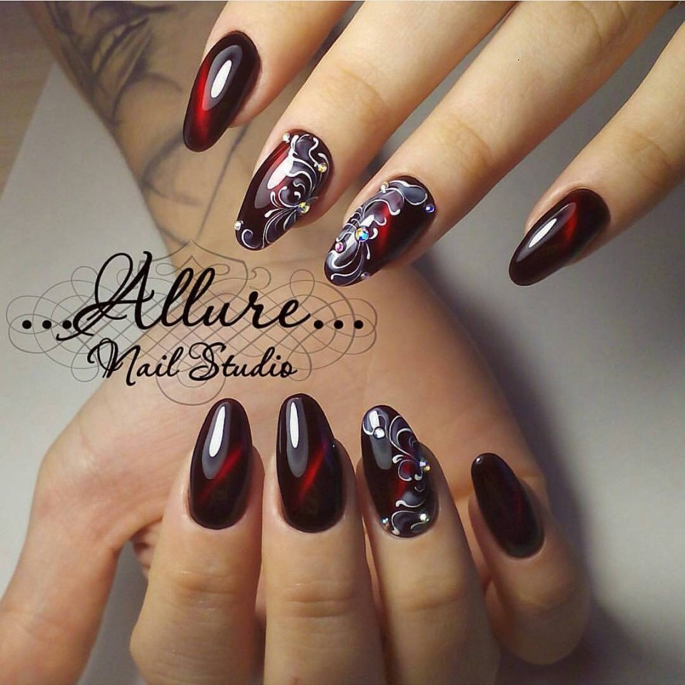 Красный маникюр кошачий глаз на миндалевидных ногтях