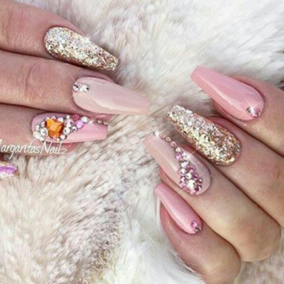 Маникюр розовый с золотом и стразами (77 фото)