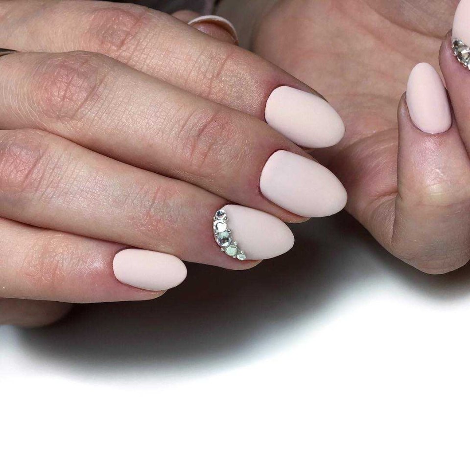 Бежевый матовый маникюр со стразами