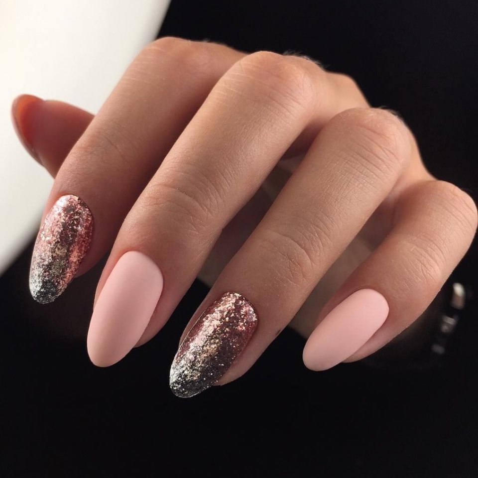 Нюдовый маникюр с блёстками миндаль 2020
