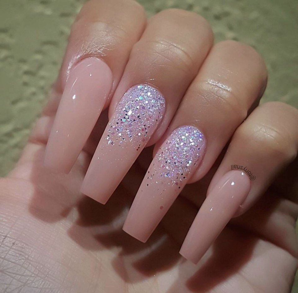Нежно розовый маникюр с блестками на длинные ногти (76 фото)