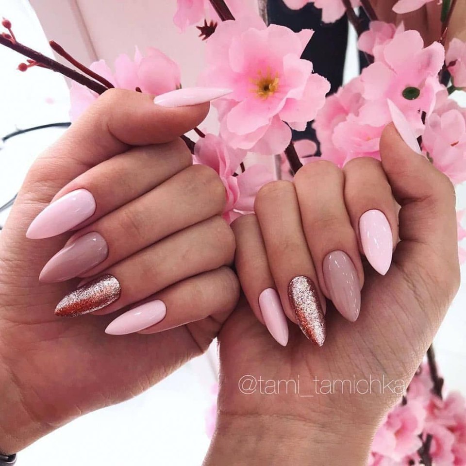 Розовые ногти с блестками миндаль