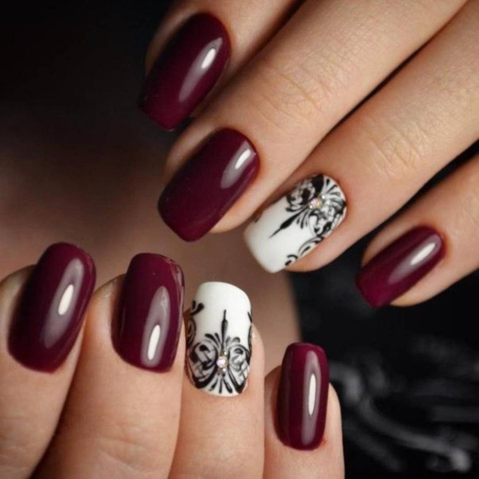 Бордовый маникюр с белым дизайном