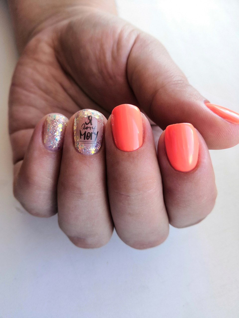 Оранжевые ногти с надписью