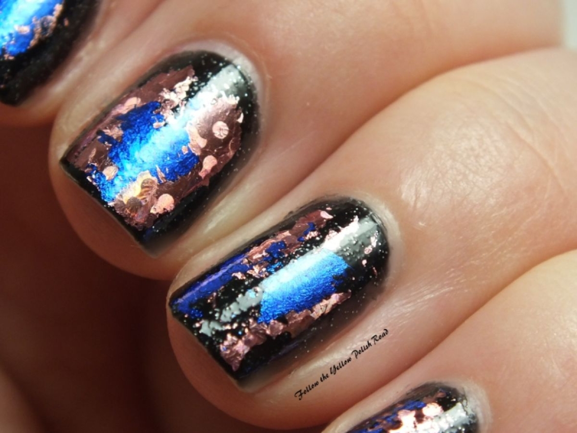 Желтый цвет ногтей с синей фольгой (52 фото)