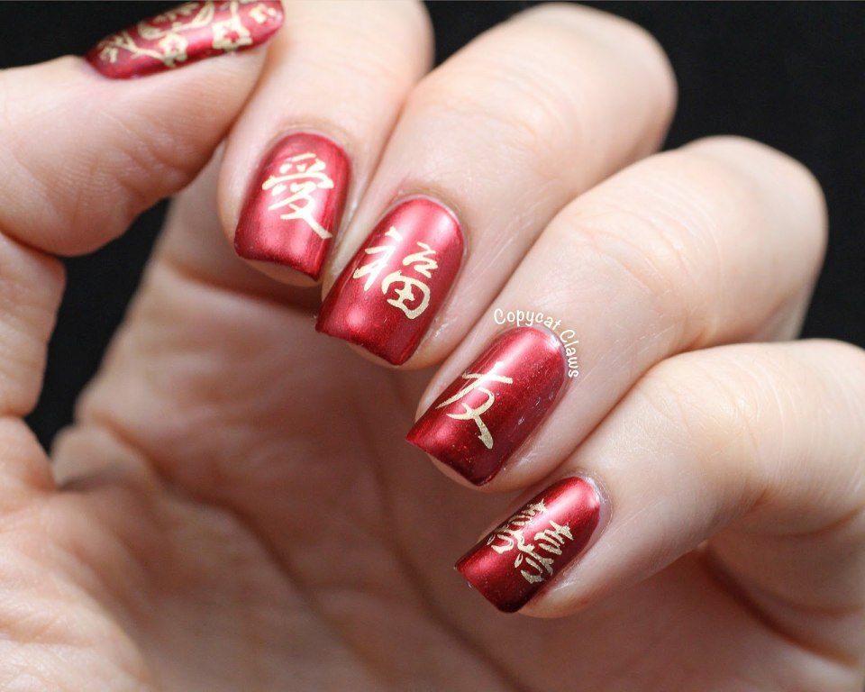 Красный маникюр с иероглифами