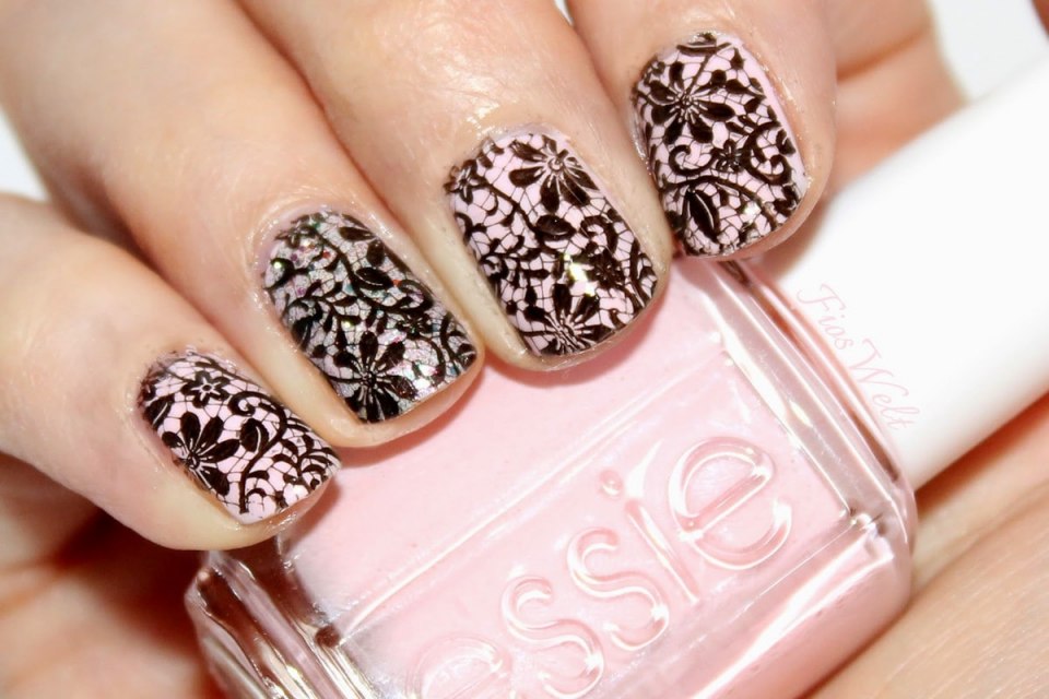 Маникюр бежевый с черным кружевом