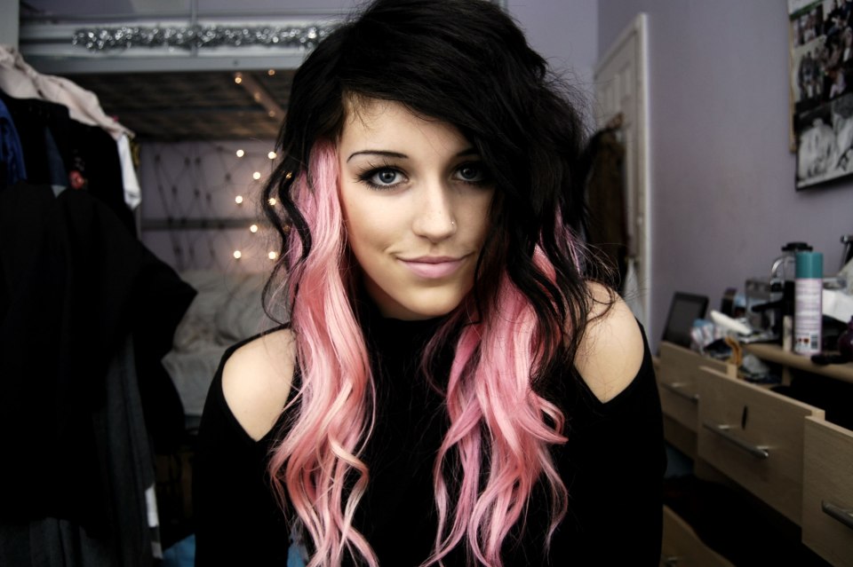 Черные волосы с розовыми прядями