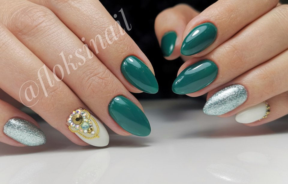 Маникюр изумрудного цвета с серебром (36 фото)