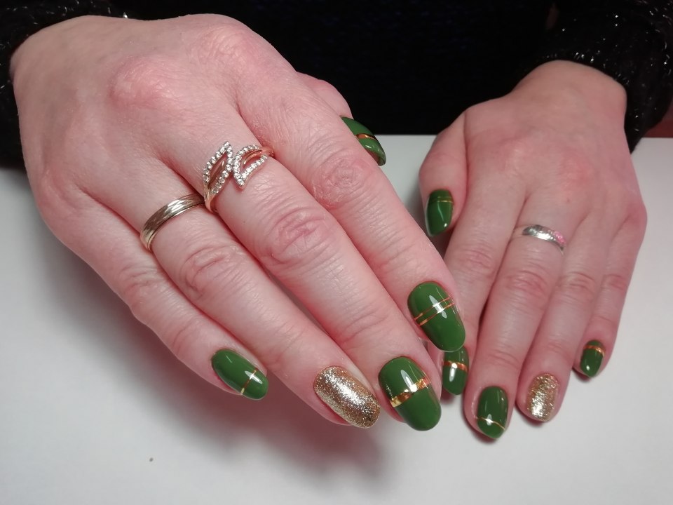 Изумрудный маникюр с золотом 3 пальца Изумрудные и 2 пальца золотых