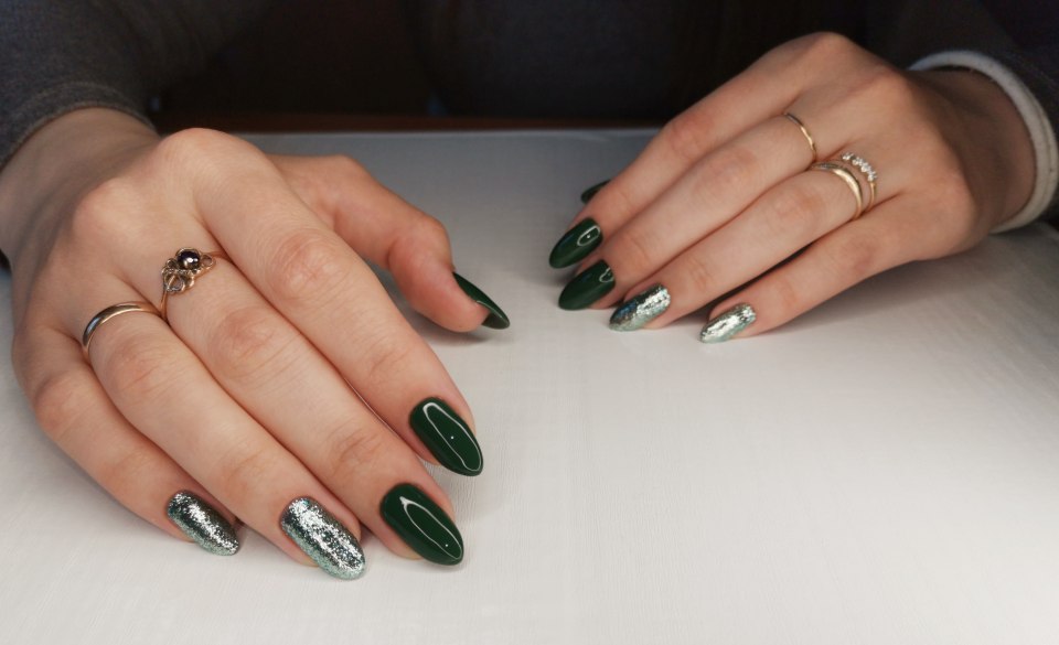 Ногти темно зеленые с серебром