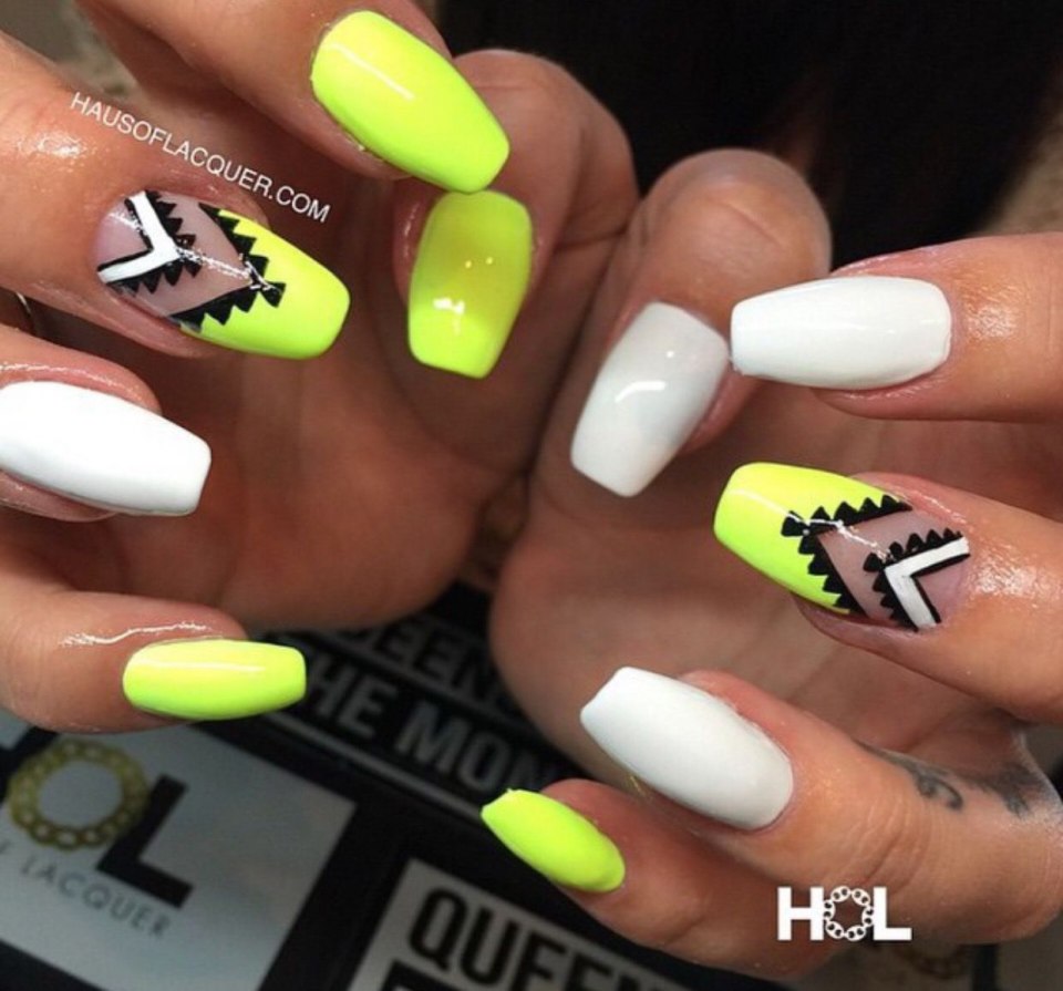 Неоновый маникюр на длинные ногти геометрия