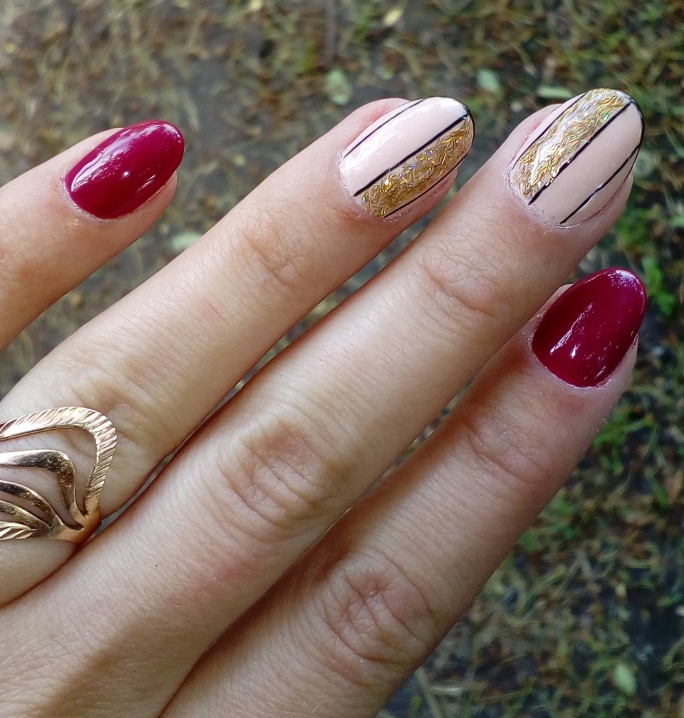 Бордовый маникюр с золотой полоской вдоль (33 фото)
