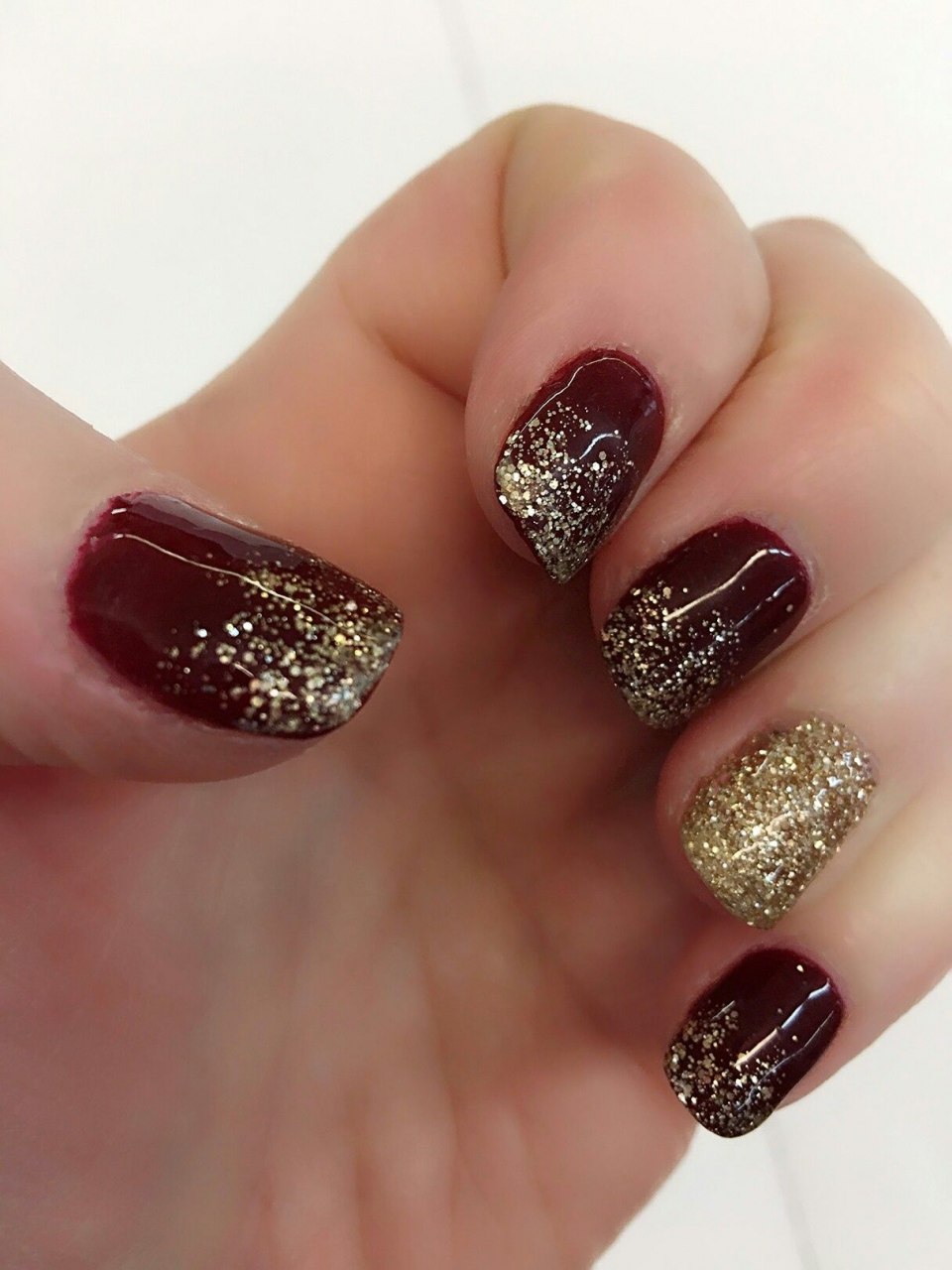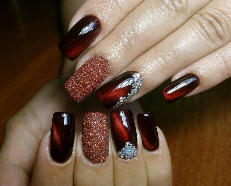 Бордовый маникюр с золотыми блестками
