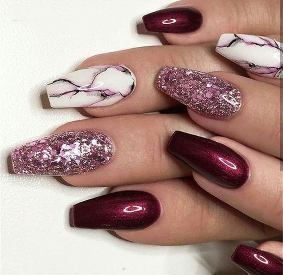 Бордовый маникюр с блестками