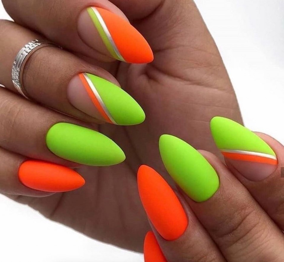 Маникюр салатовый с оранжевым