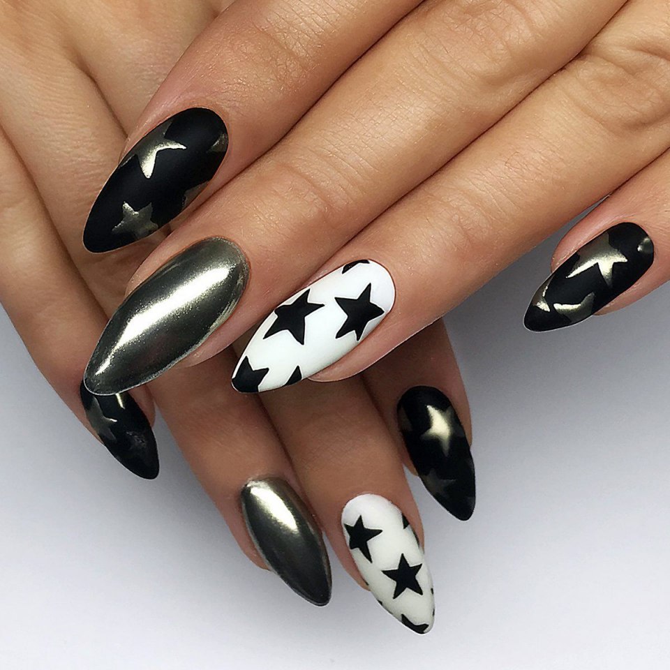 Маникюр на длинные ногти миндалевидной формы с дизайном 2021 черные