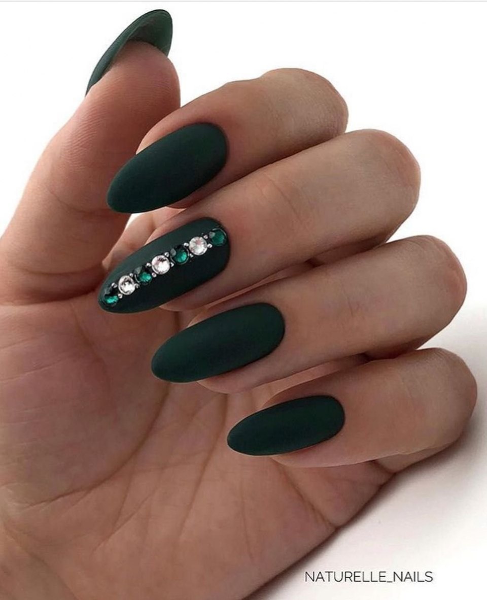 Матовый зеленый маникюр миндалевидной формы изумрудный