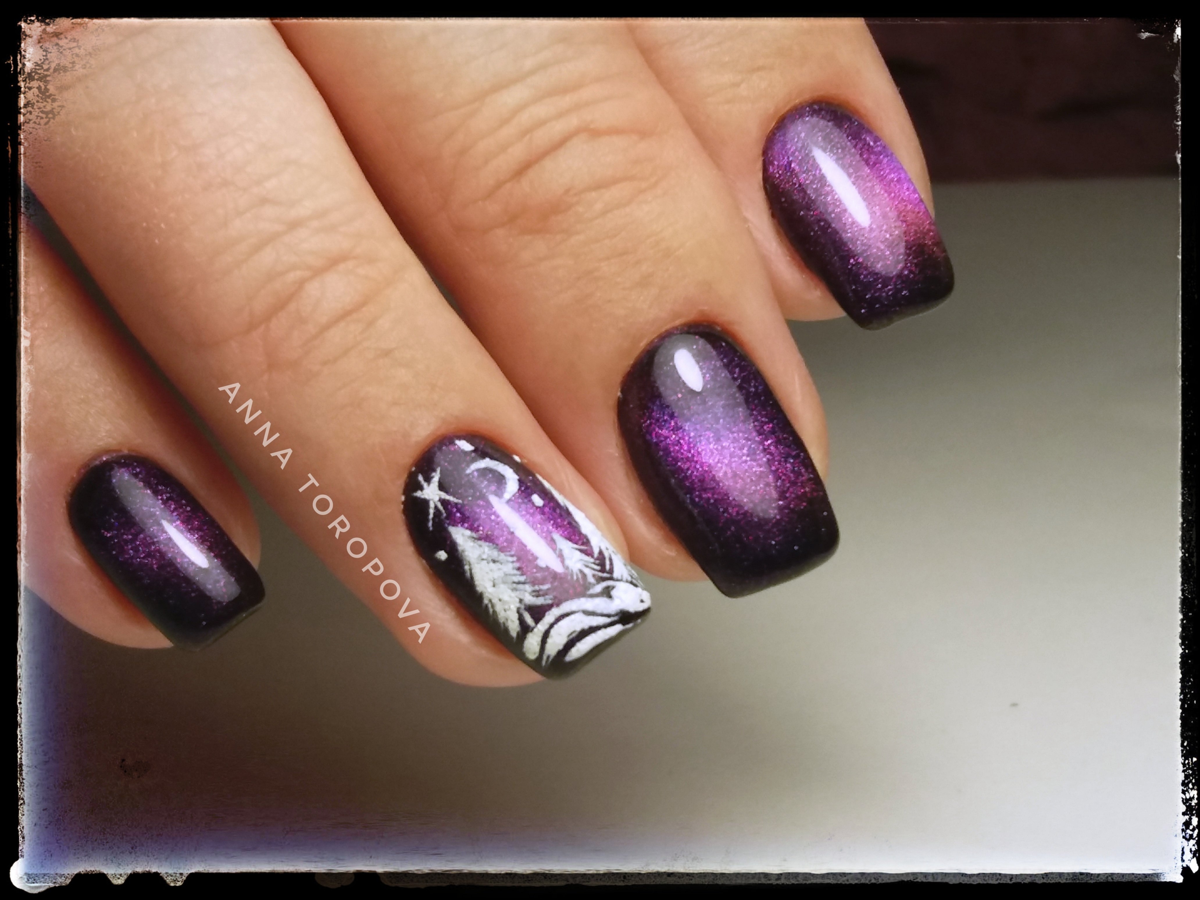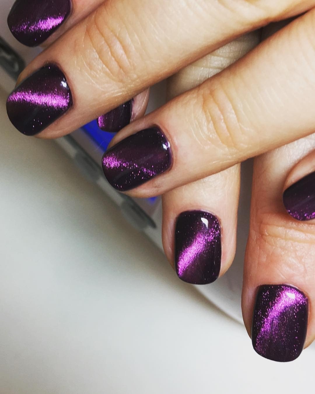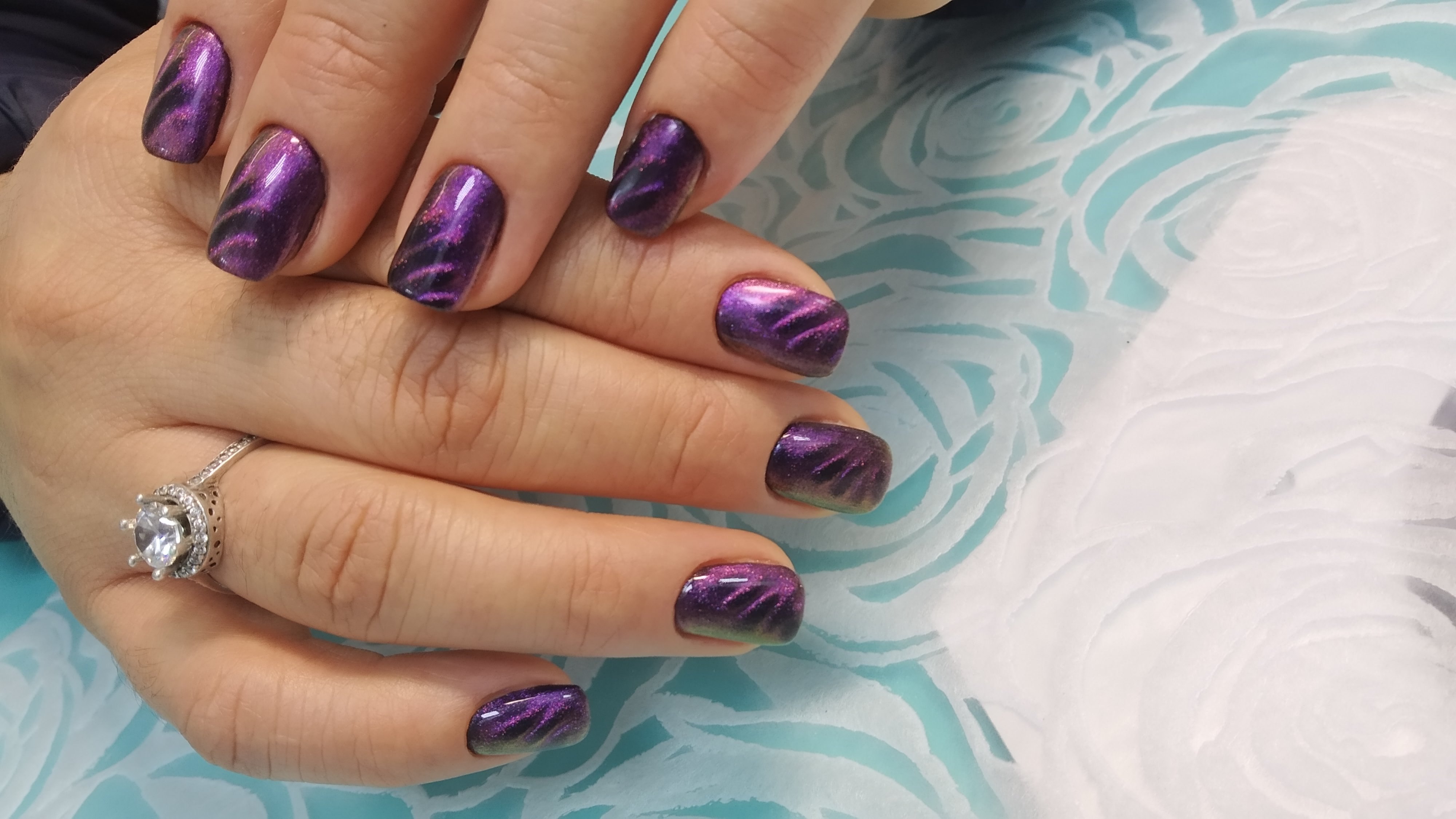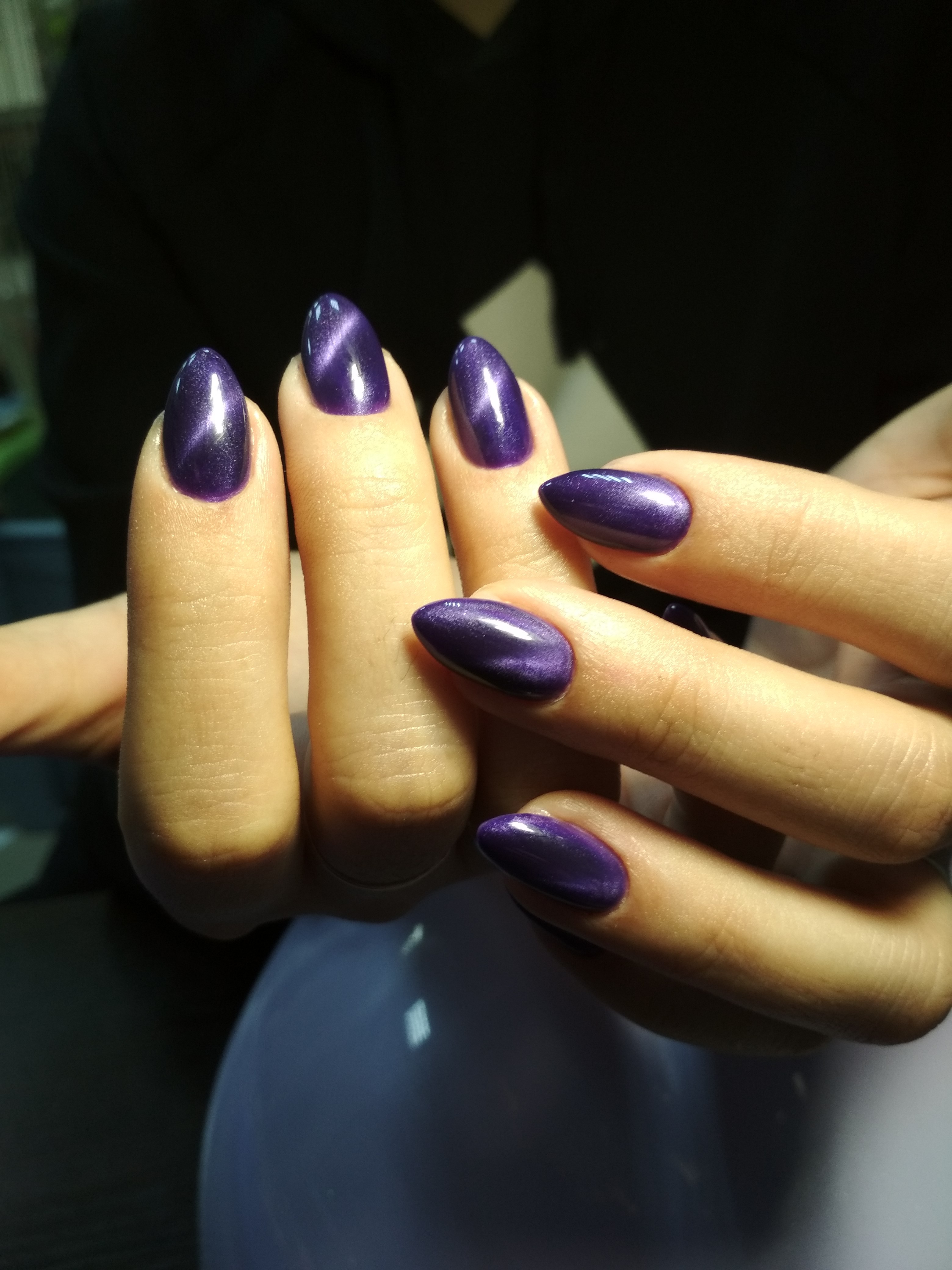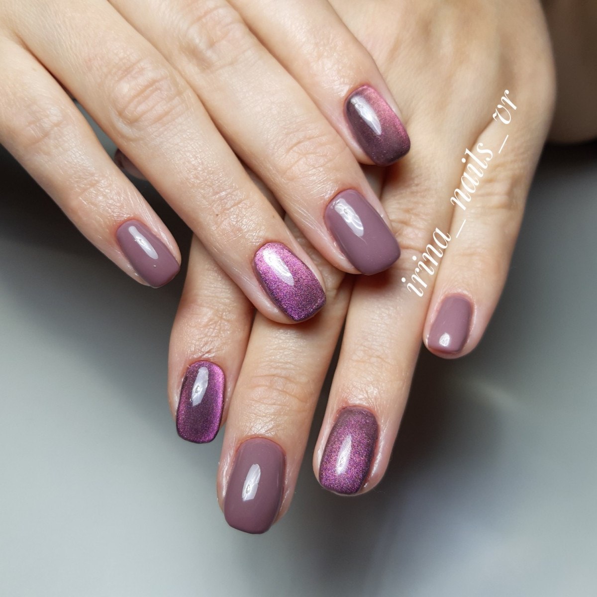 Сиреневый кошачий глаз на ногтях (52 фото)