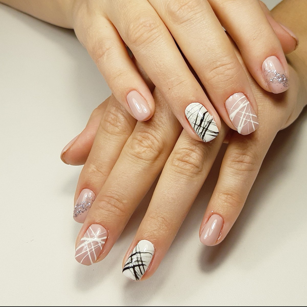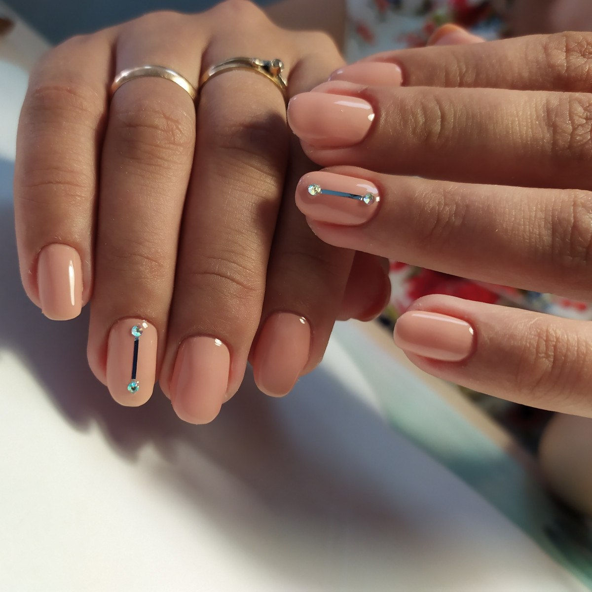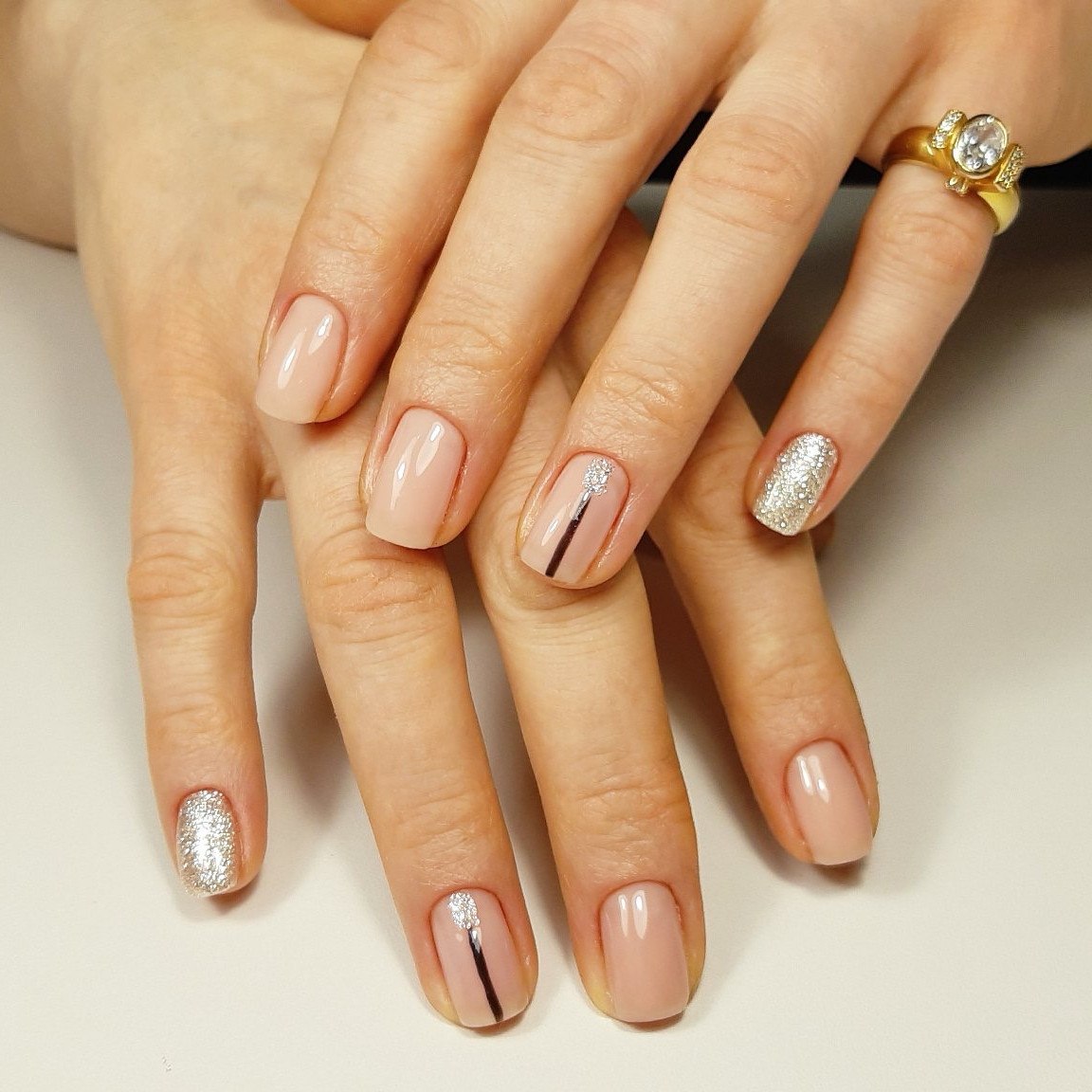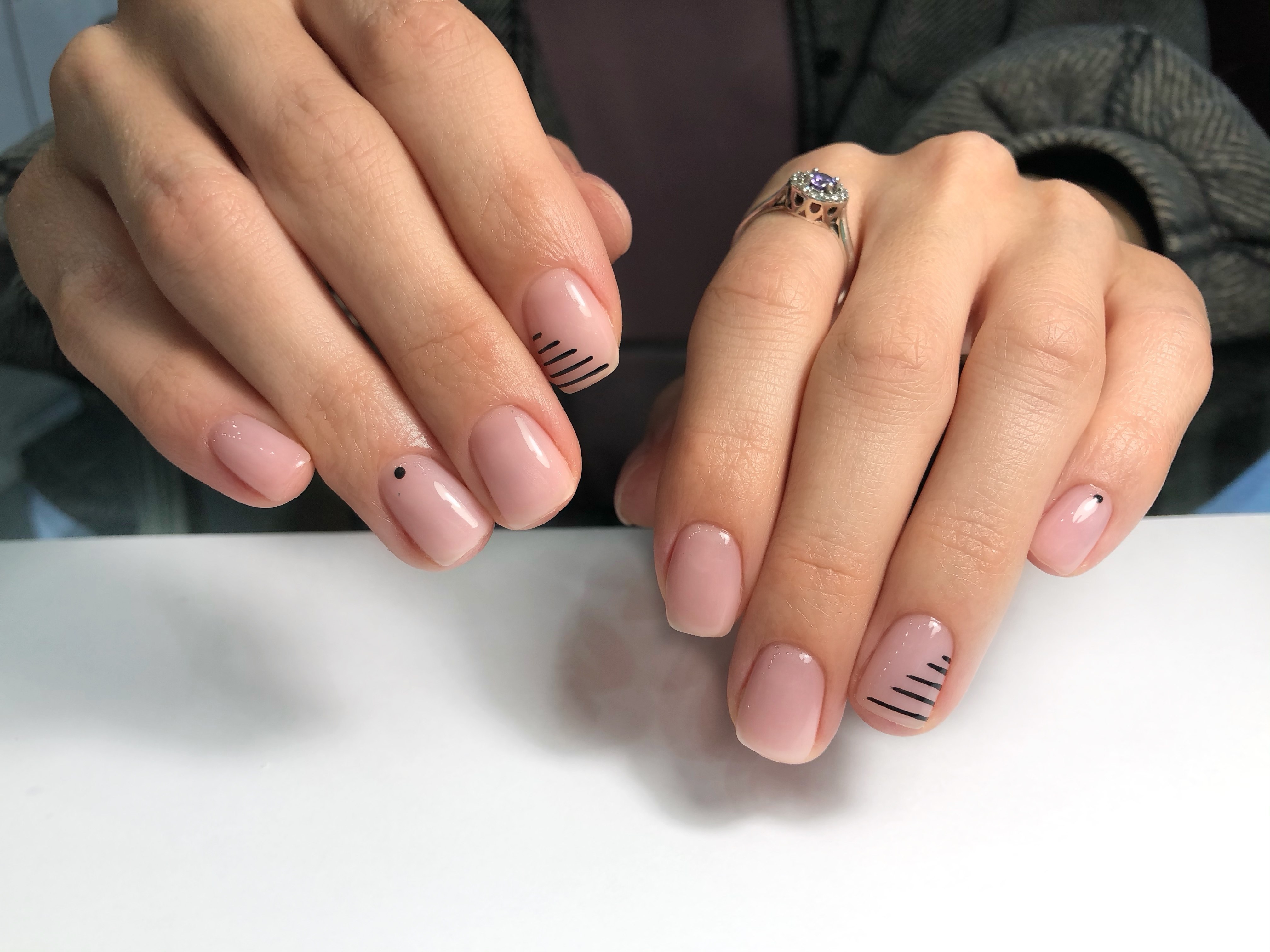 Нюдовый маникюр с полосками и стразами