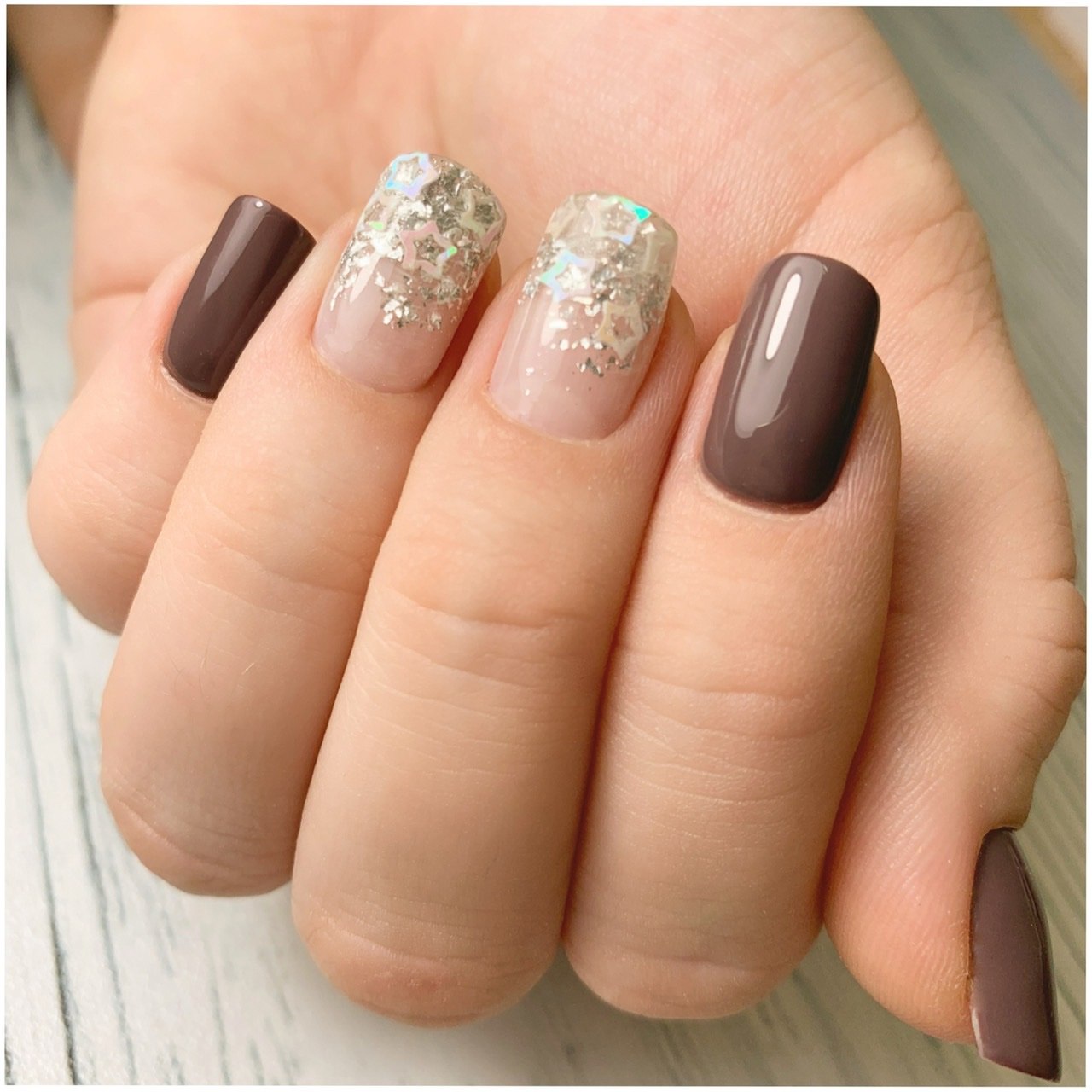Маникюр нежно коричневый с блестками