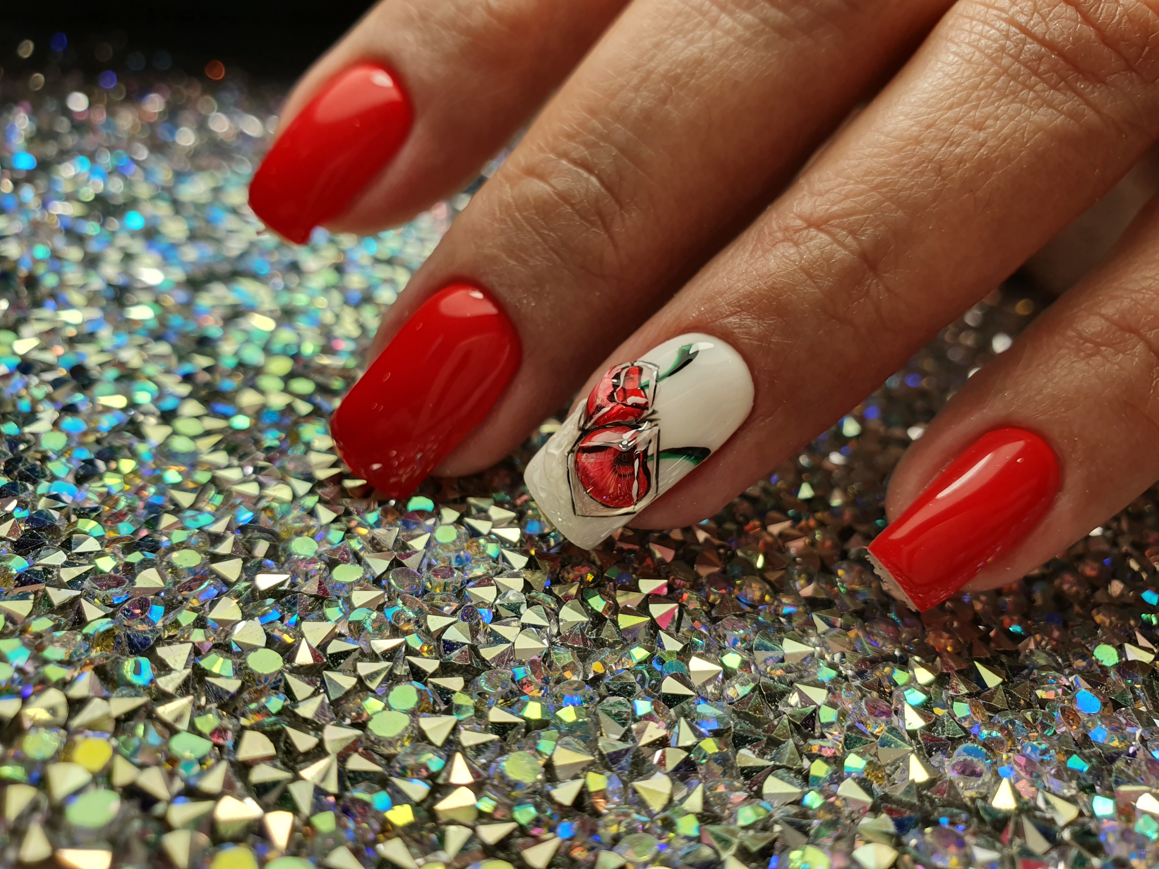 Маникюр красный с сердечками и стразами