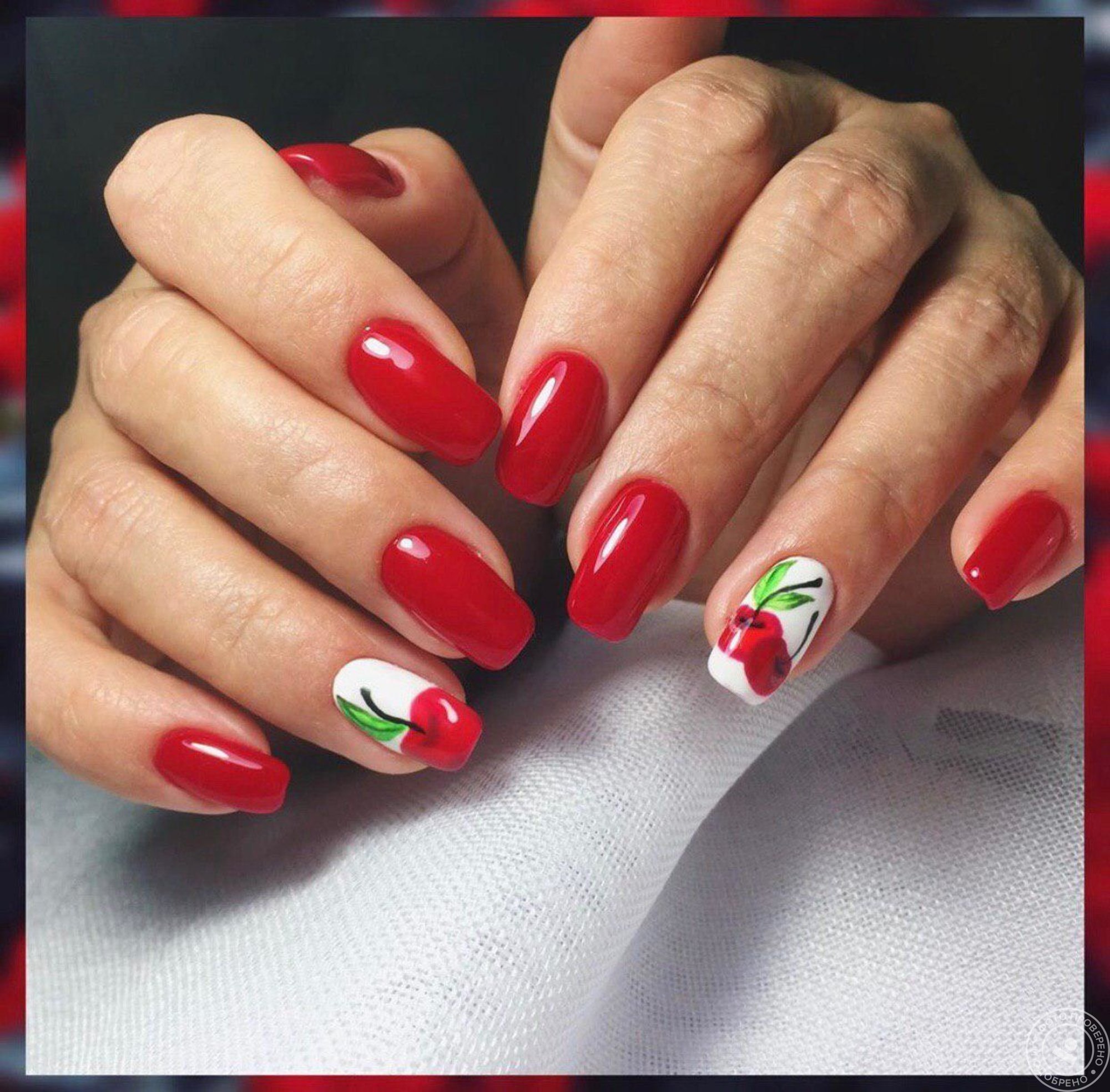 Маникюр красный с белым с вишнями