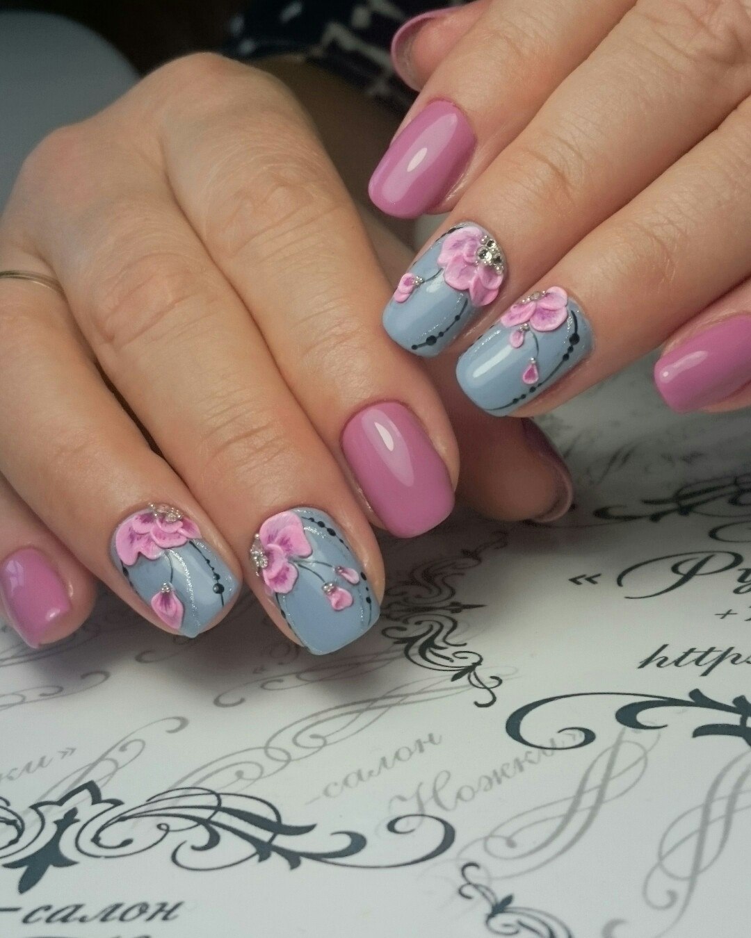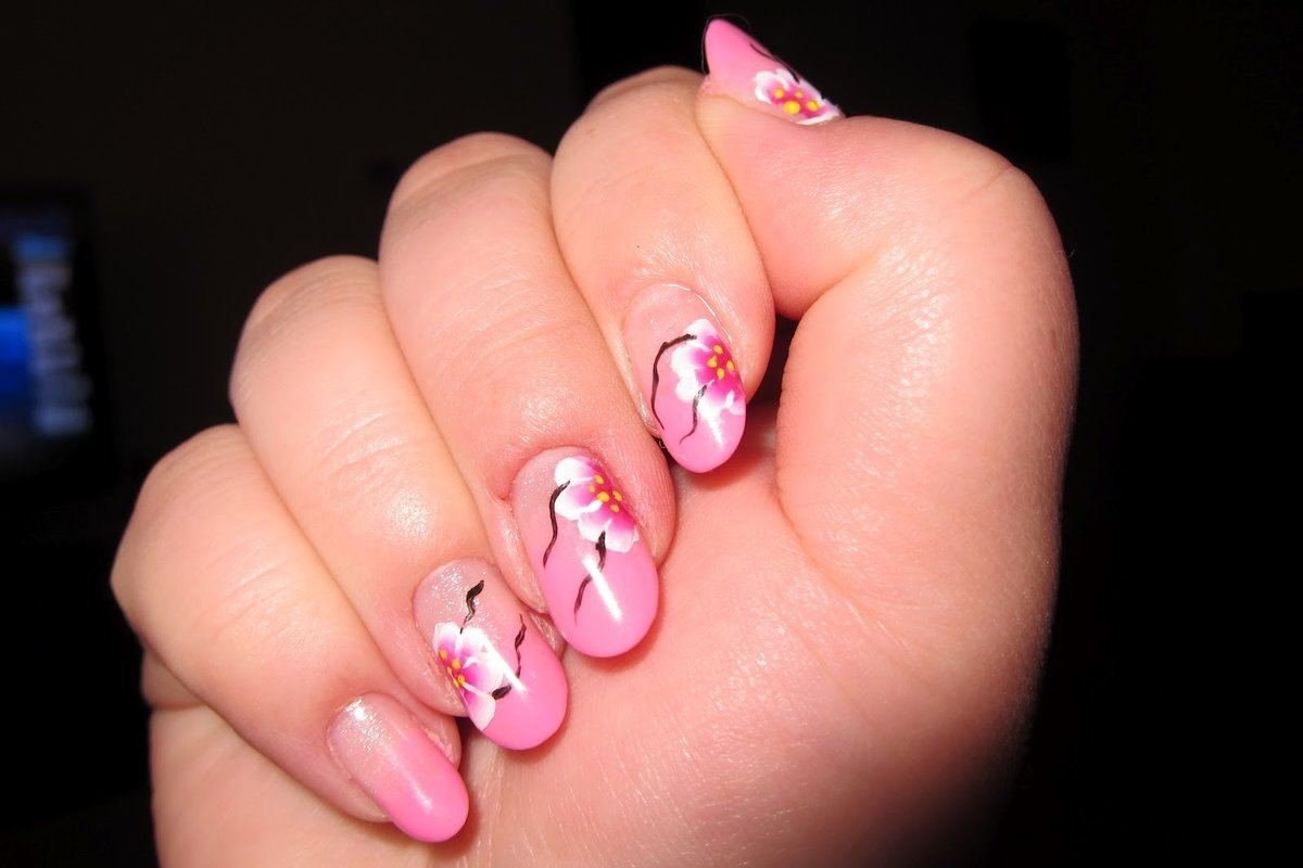 Розовый маникюр с цветочным рисунком