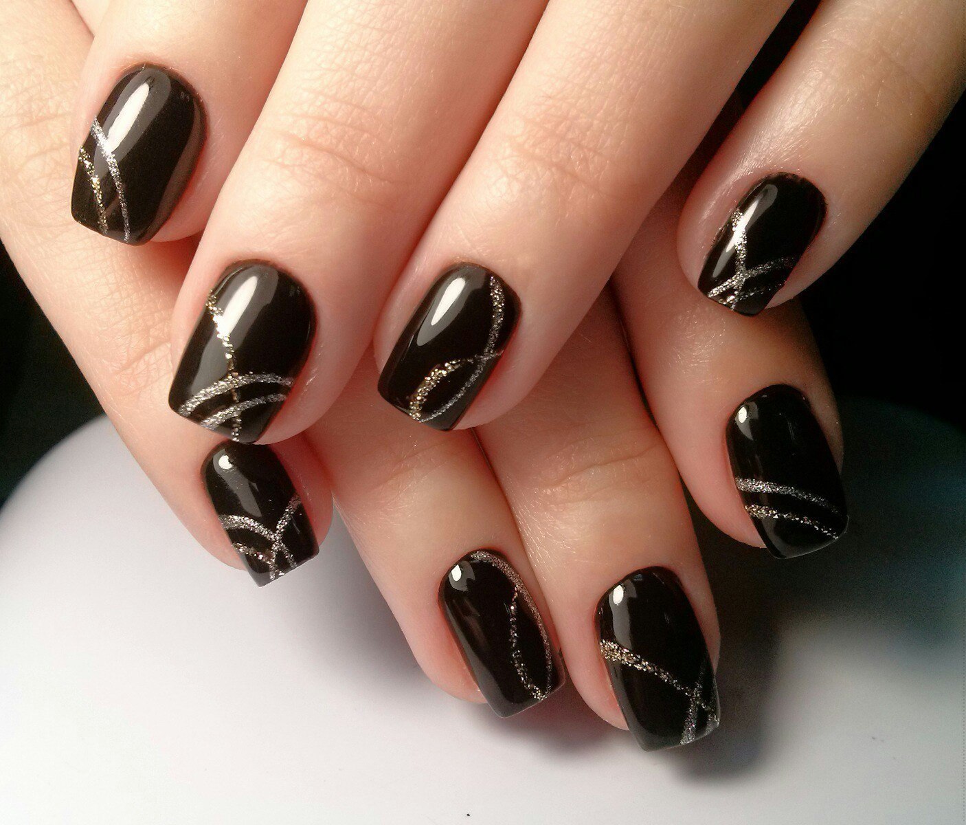 Черный маникюр с серебряной полоской