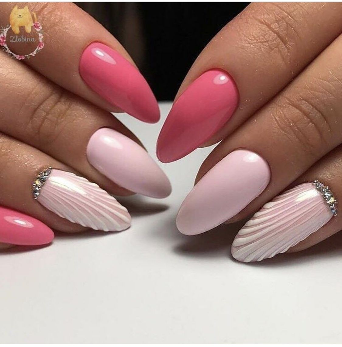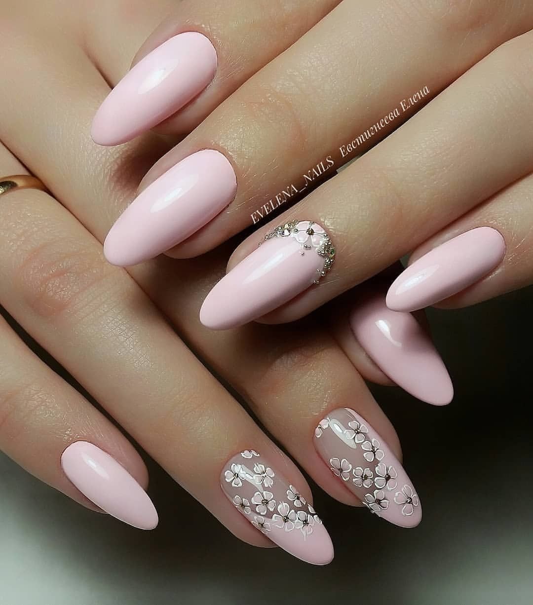 Розовый маникюр на миндалевидных ногтях