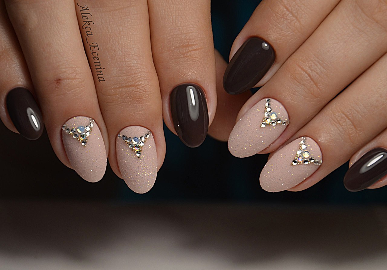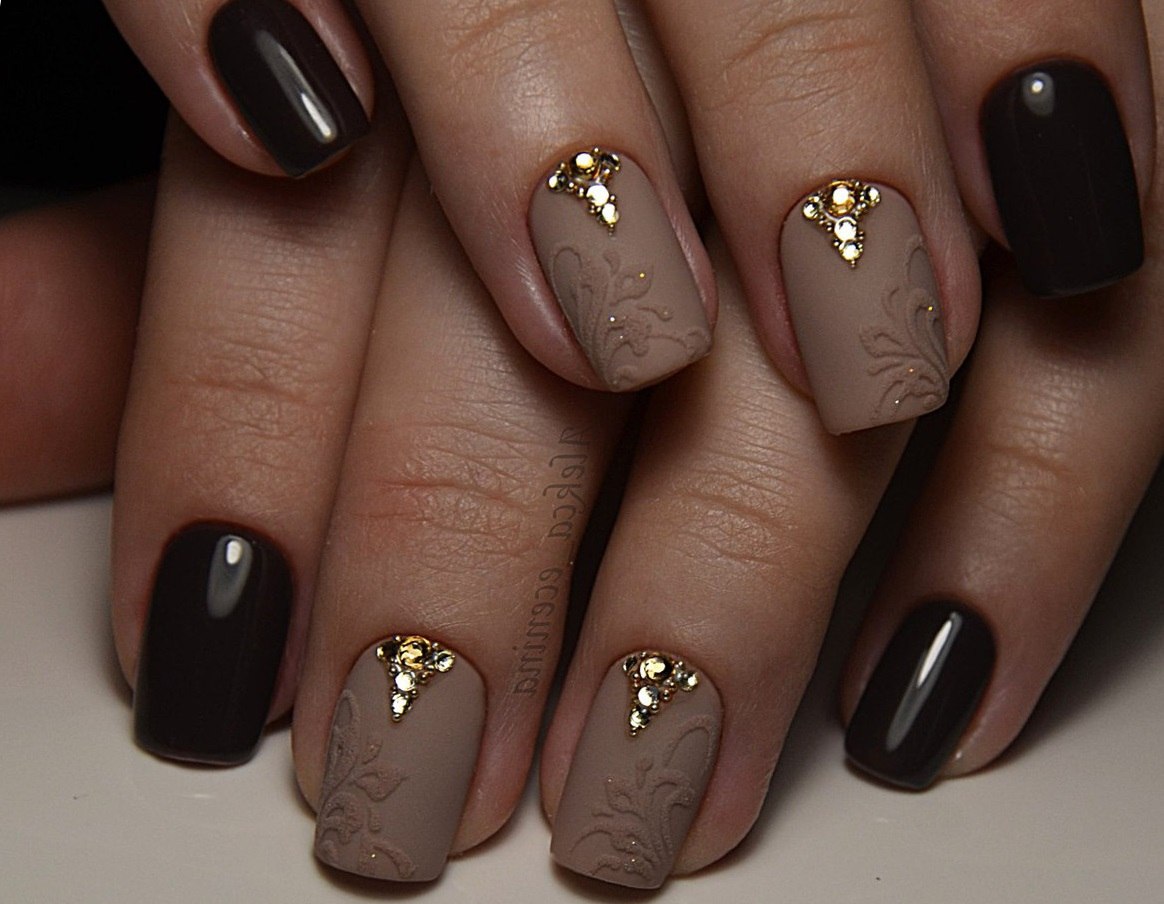 Коричневый маникюр со стразами