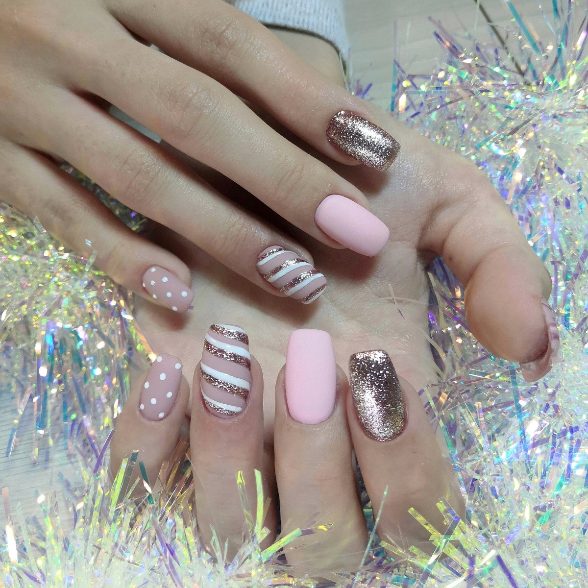 Розовый новогодний маникюр на длинные ногти
