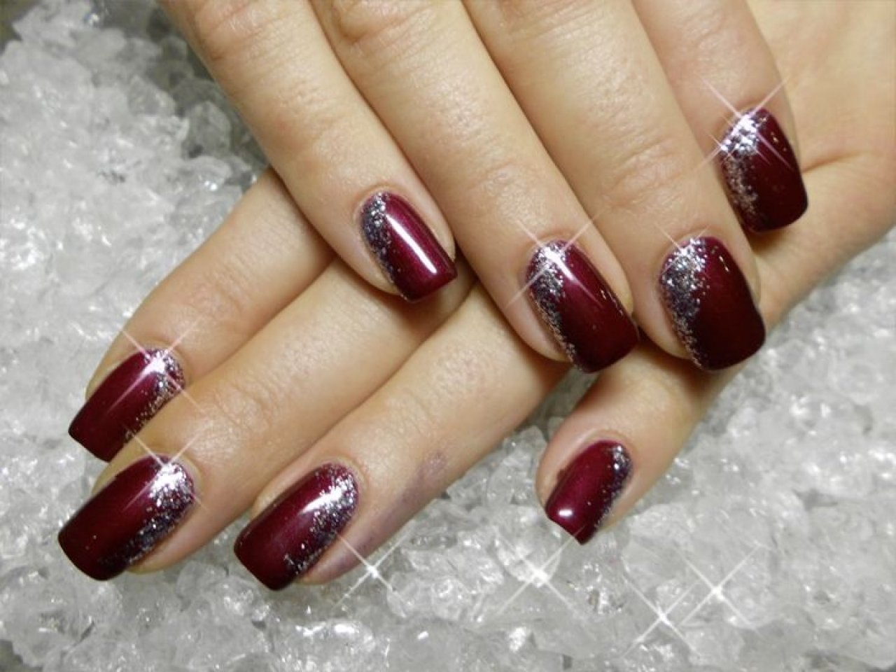 Бордовый маникюр с блестками