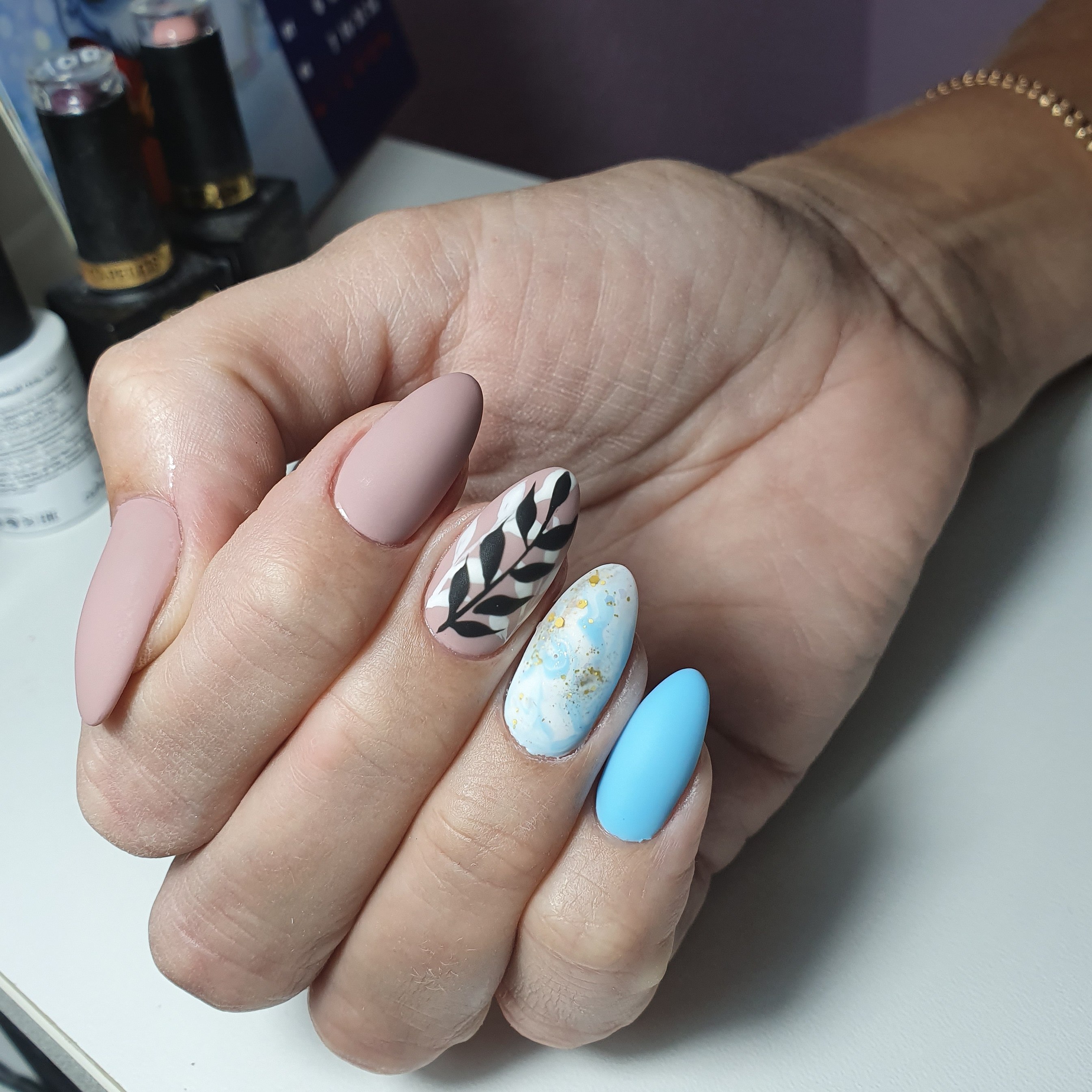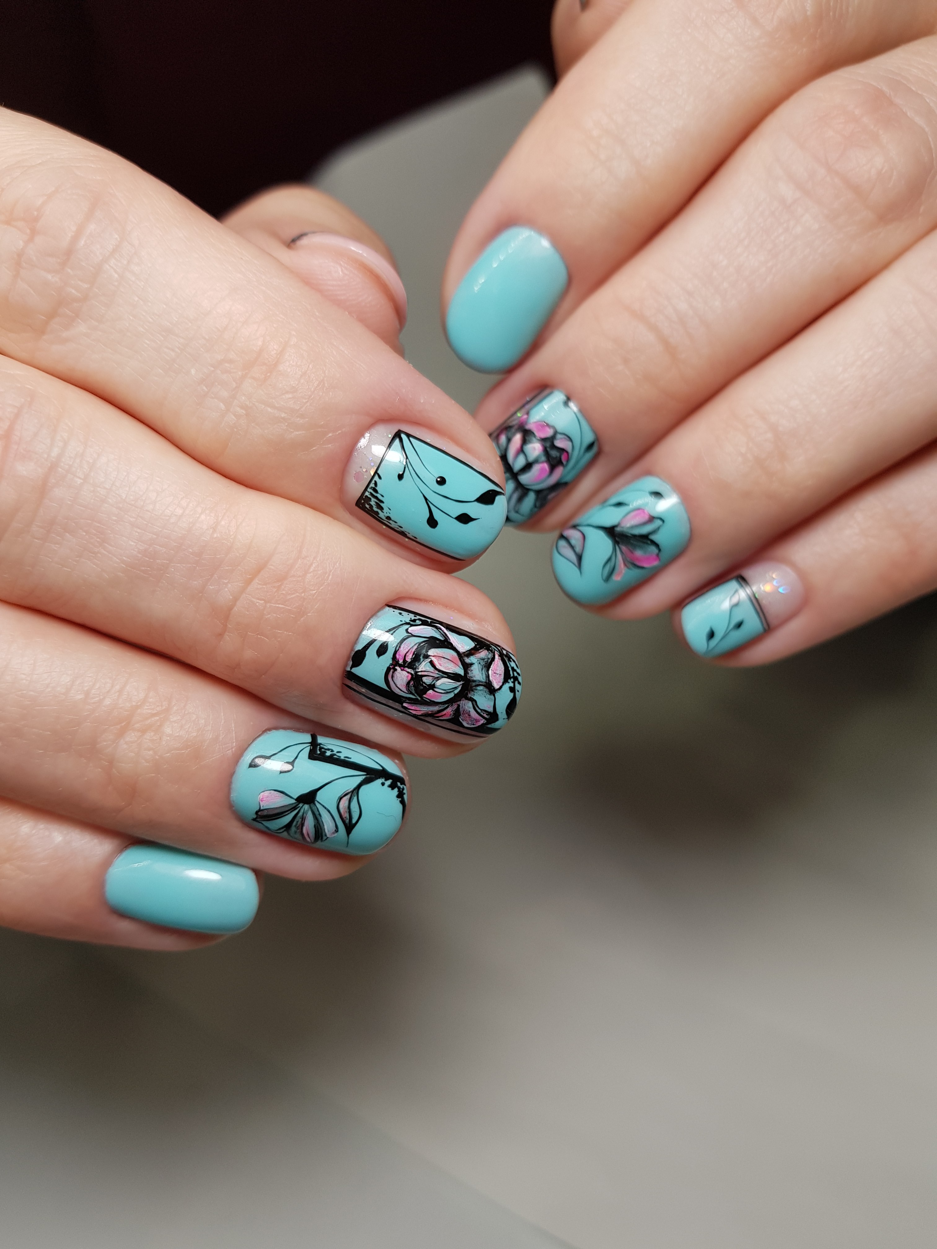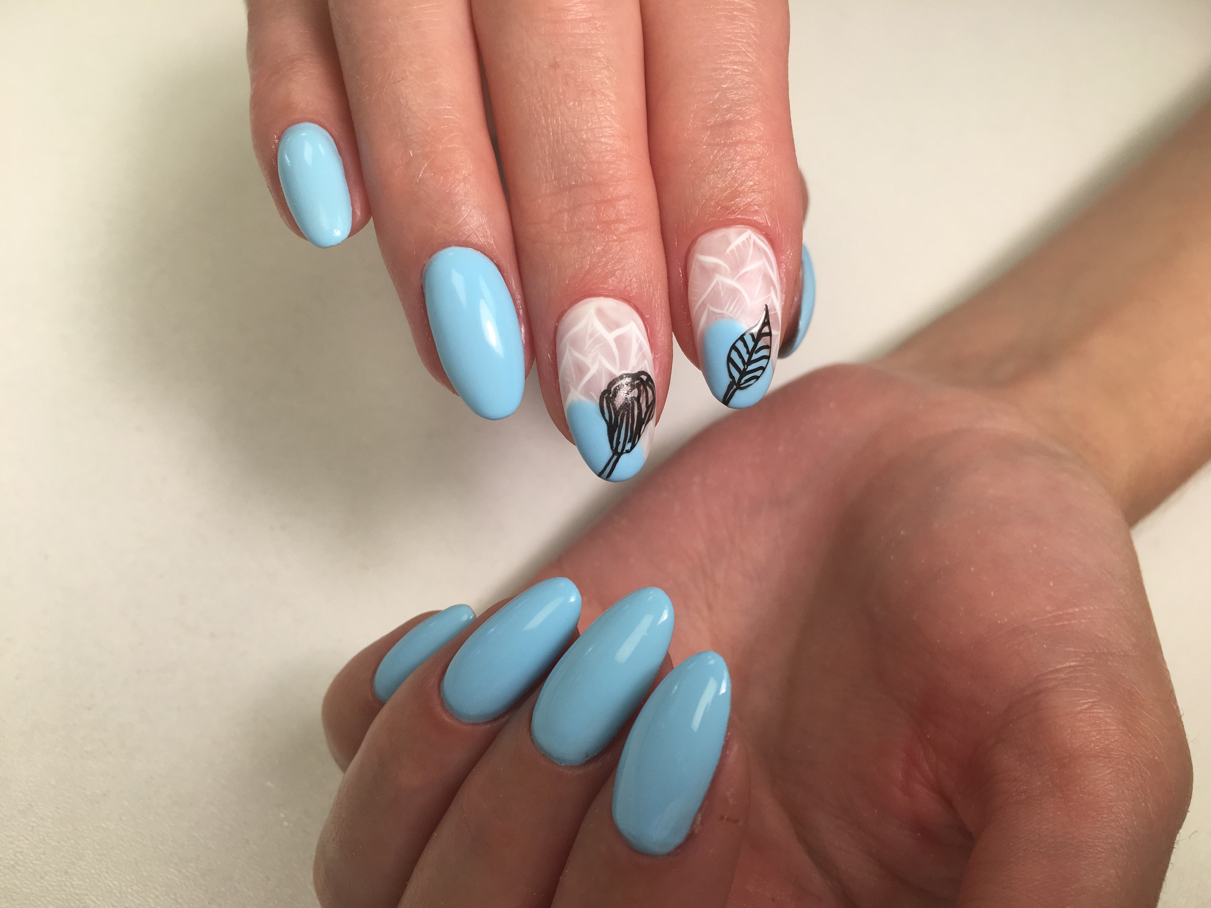 Голубой маникюр с веточкой
