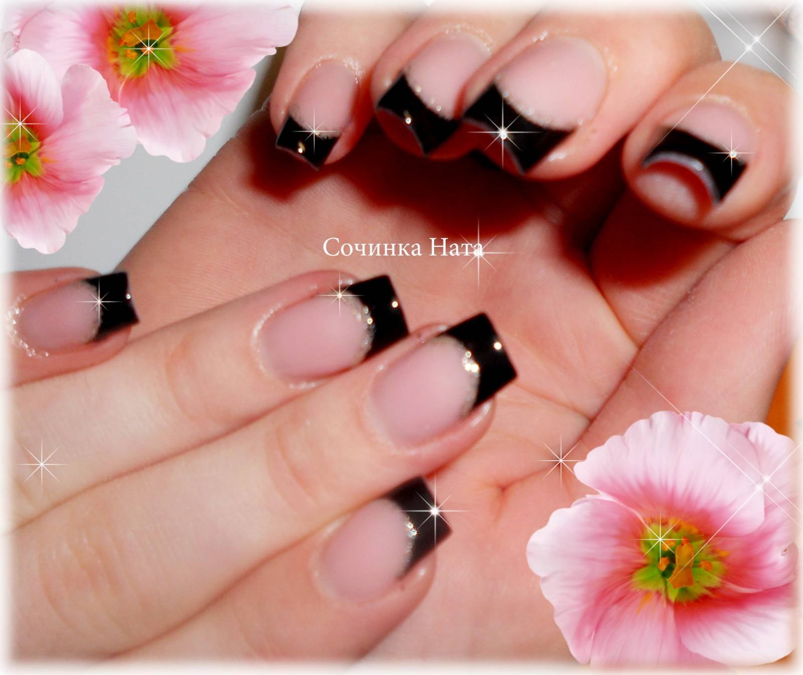 Наращивание ногтей френч черный с цветами