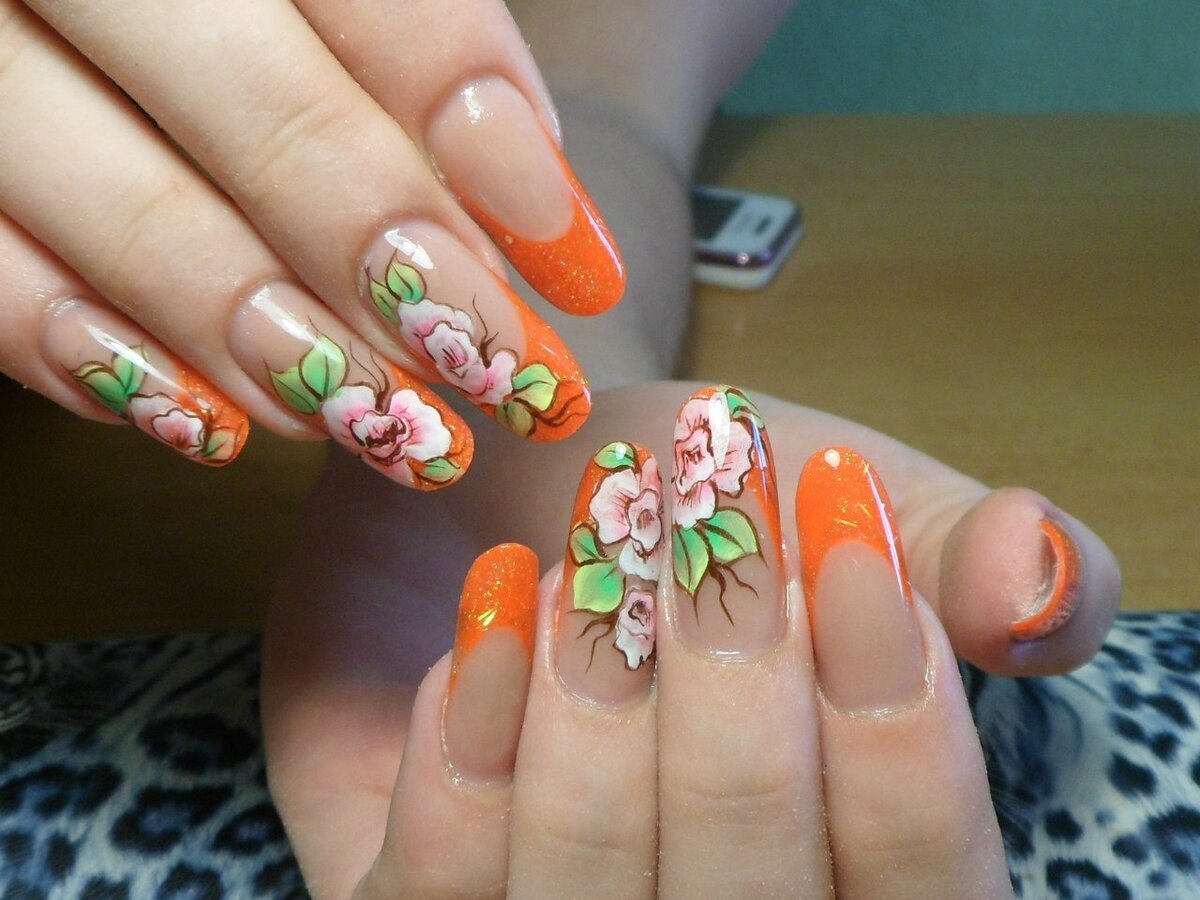 Оранжевый френч с дизайном на ногтях (41 фото)