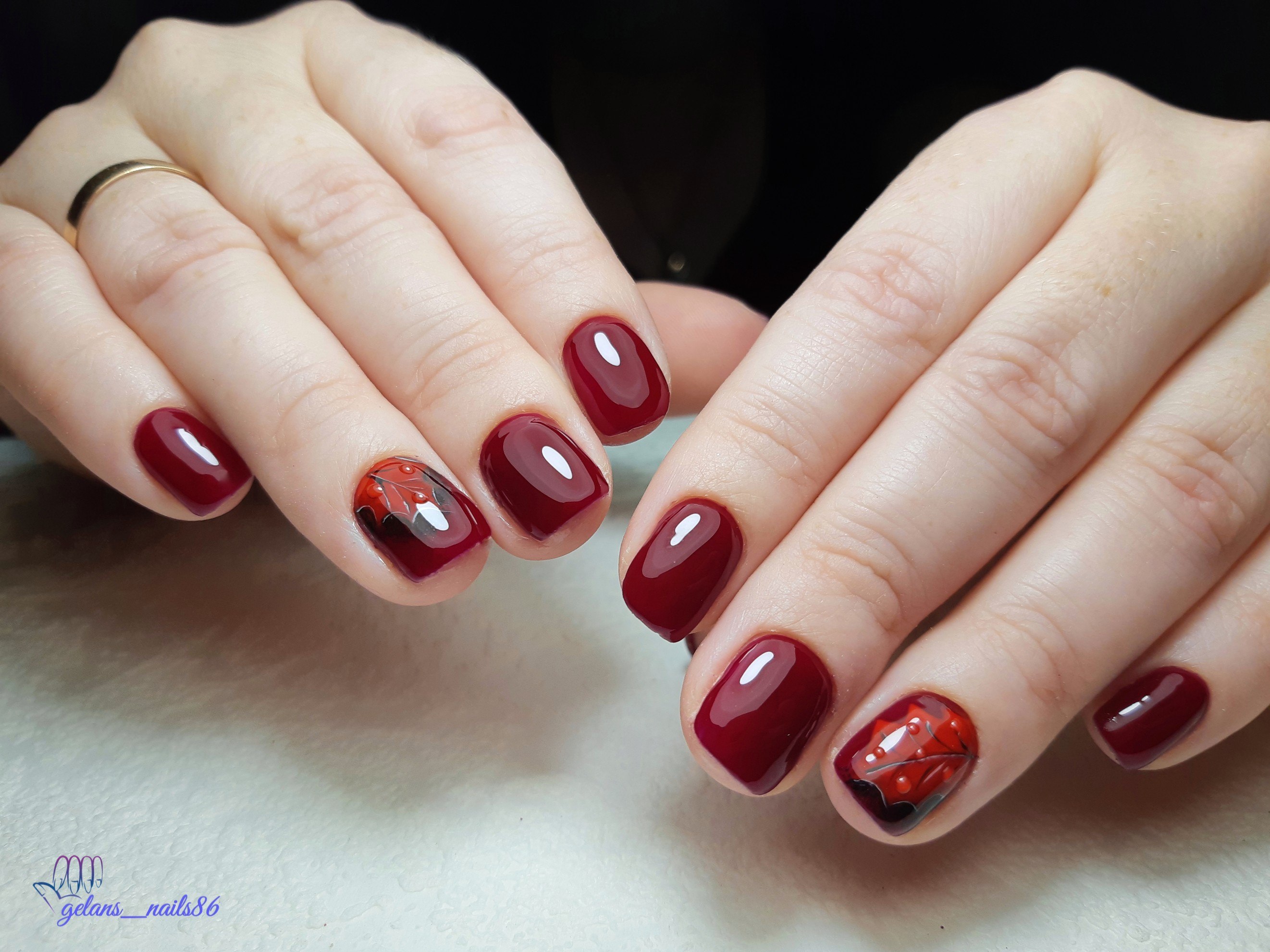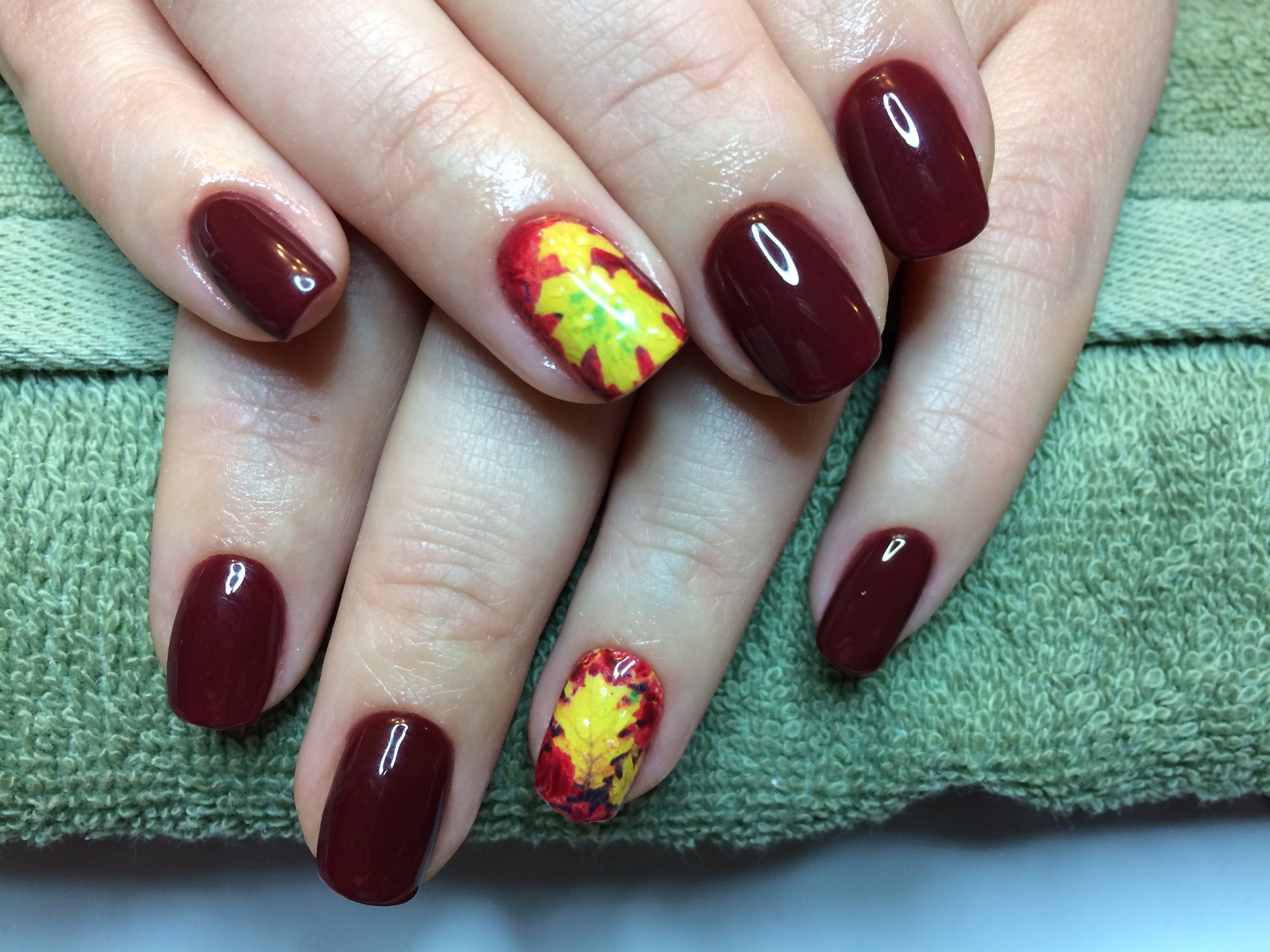 Ногти бордовые с листочками осенними