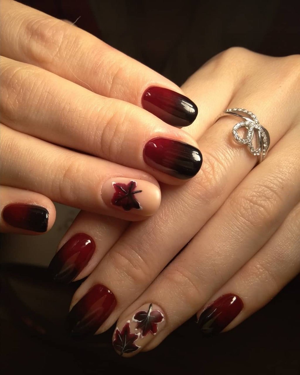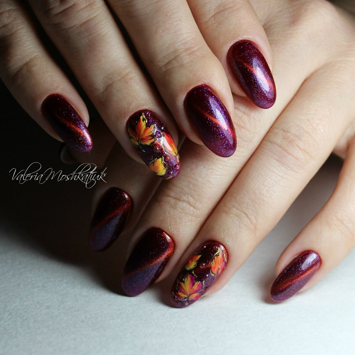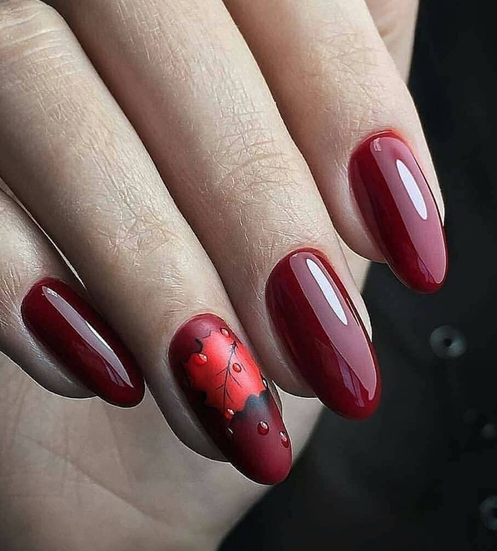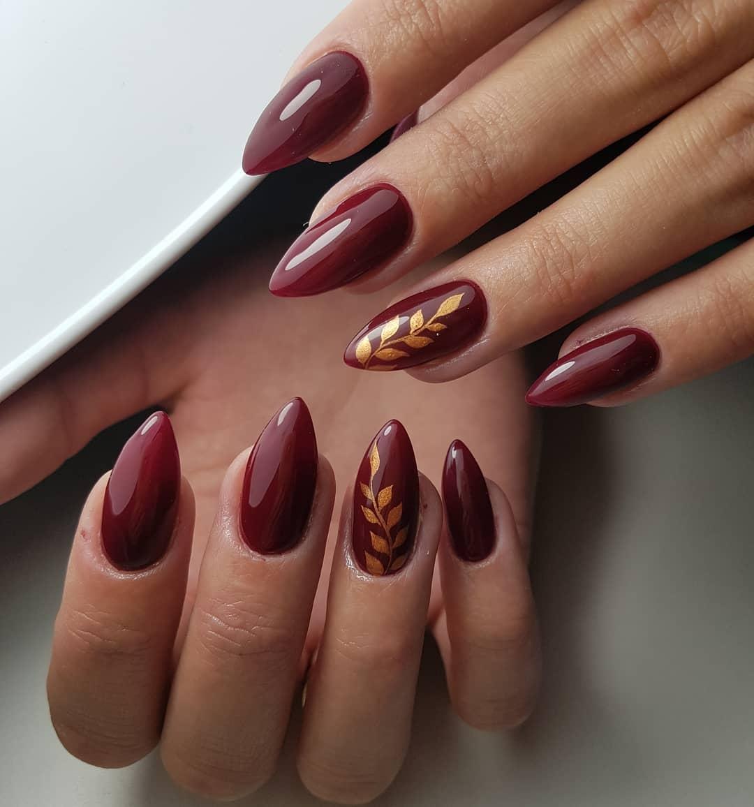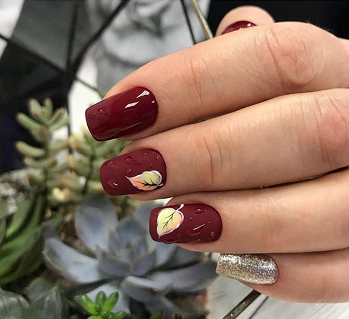 Бордовый маникюр с осенними листьями (44 фото)