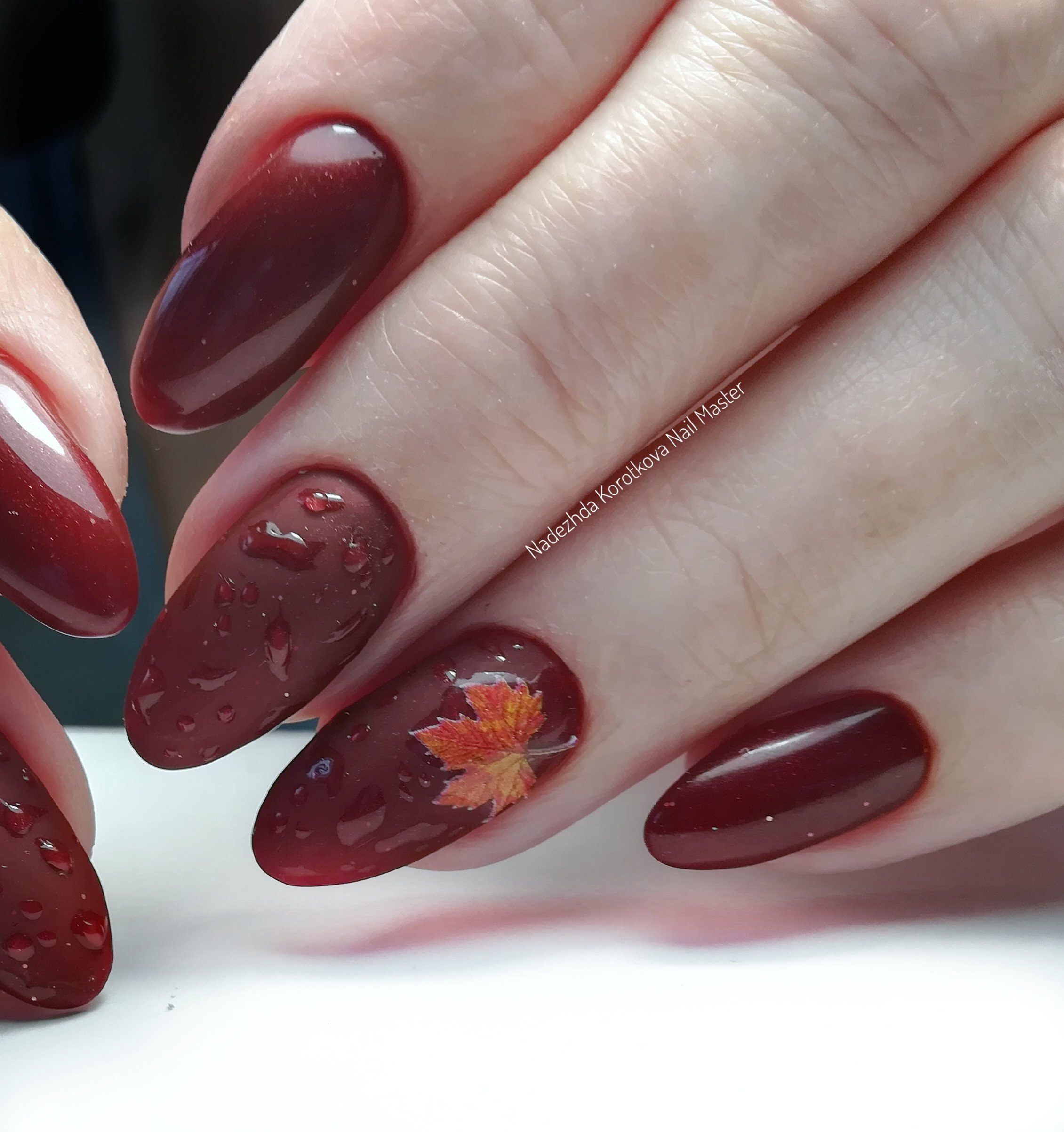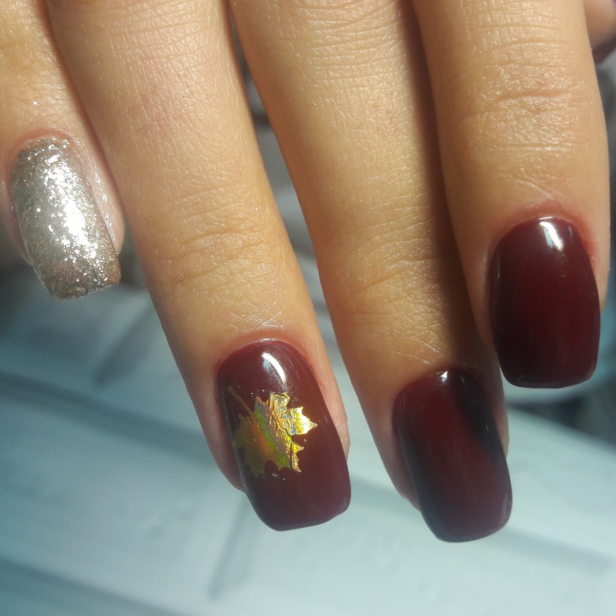Бордовый маникюр с кленовым листом