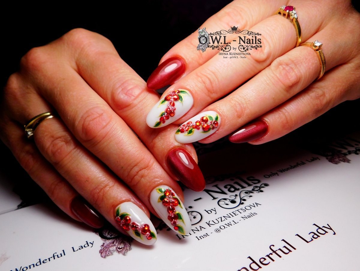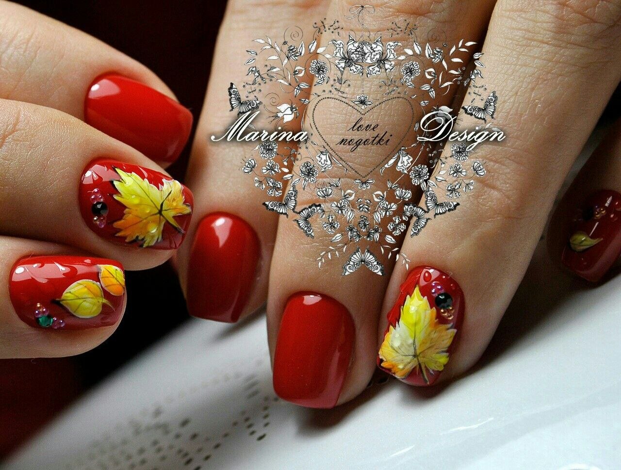 Красный маникюр с листиками