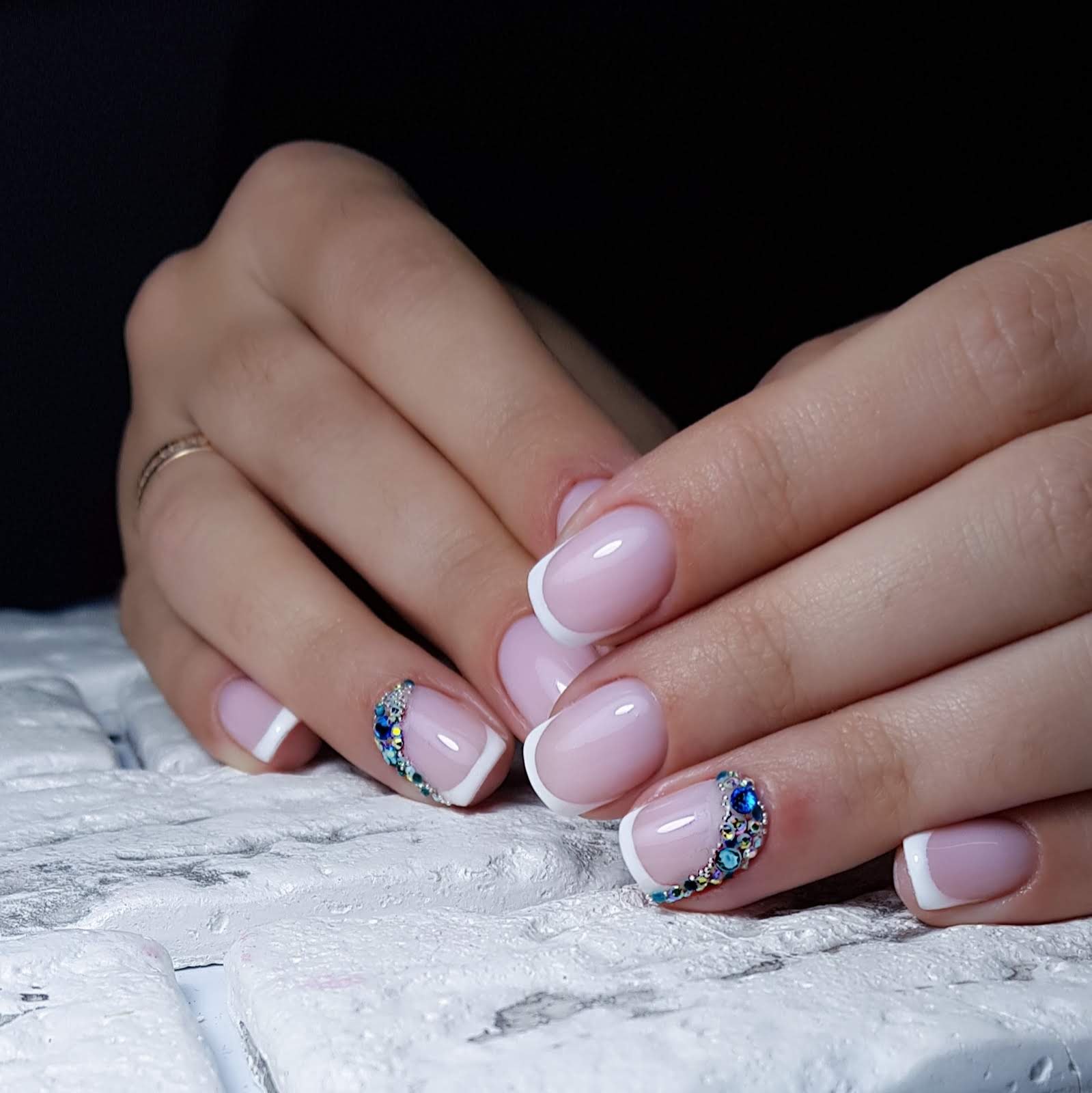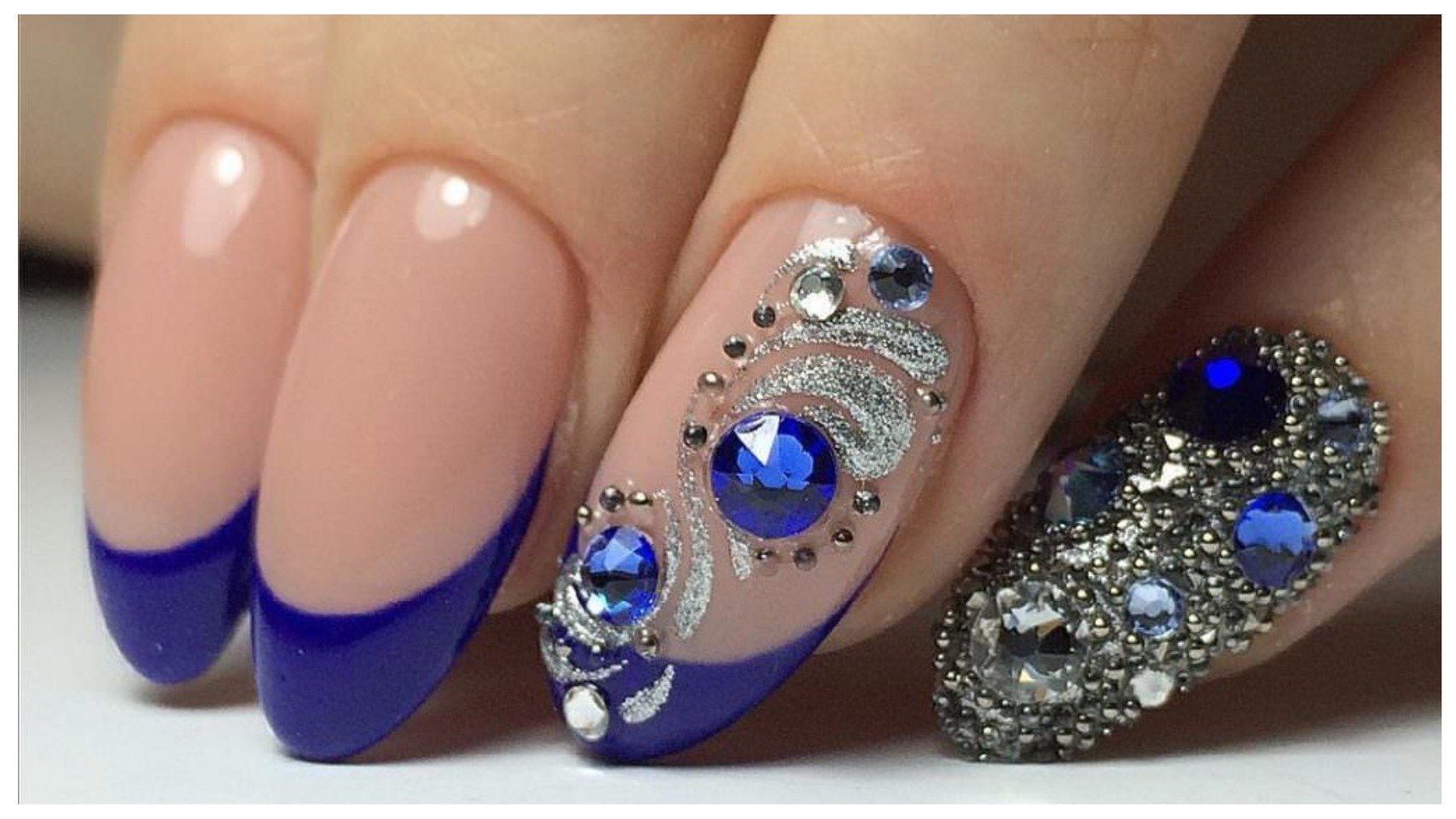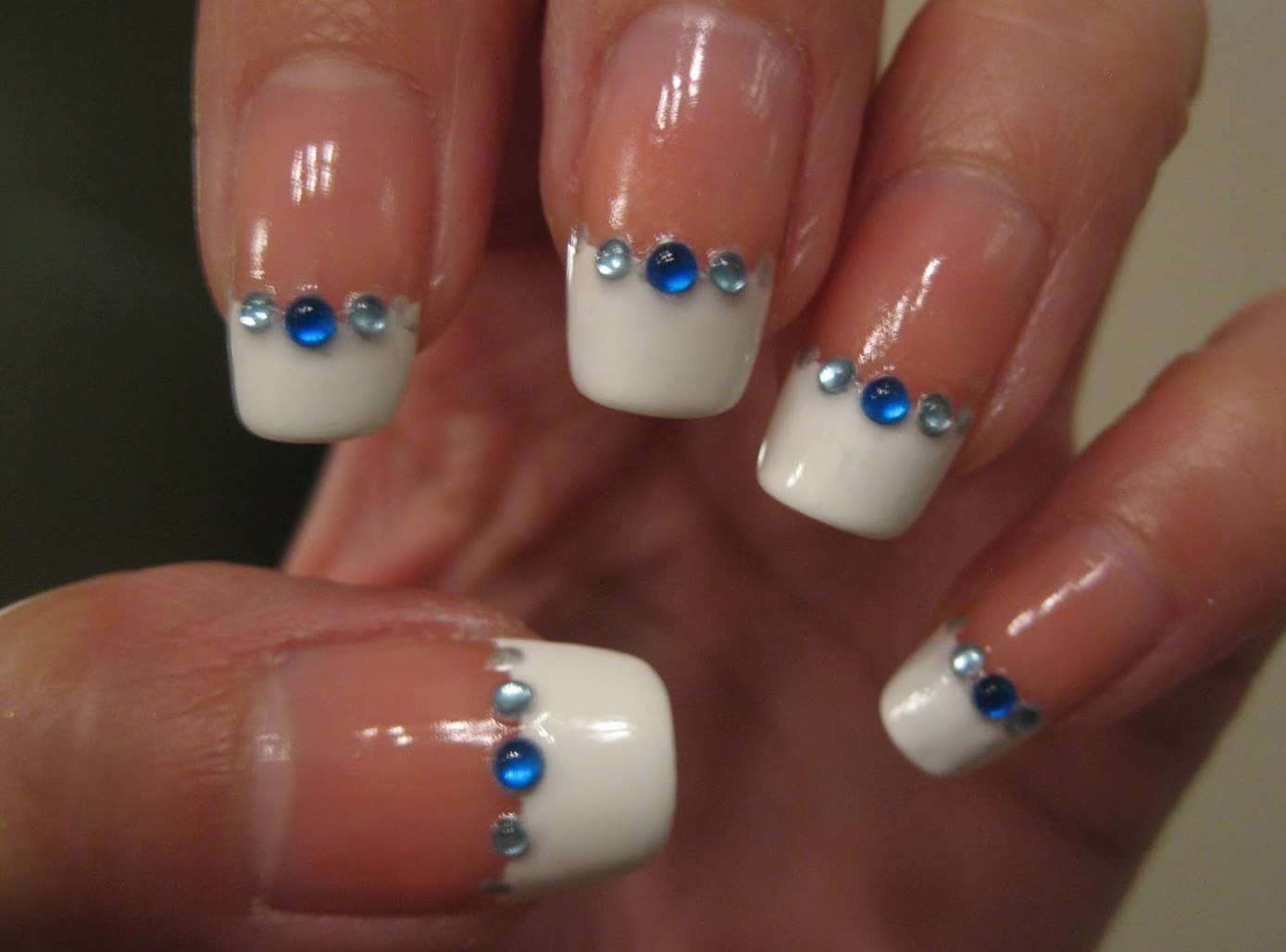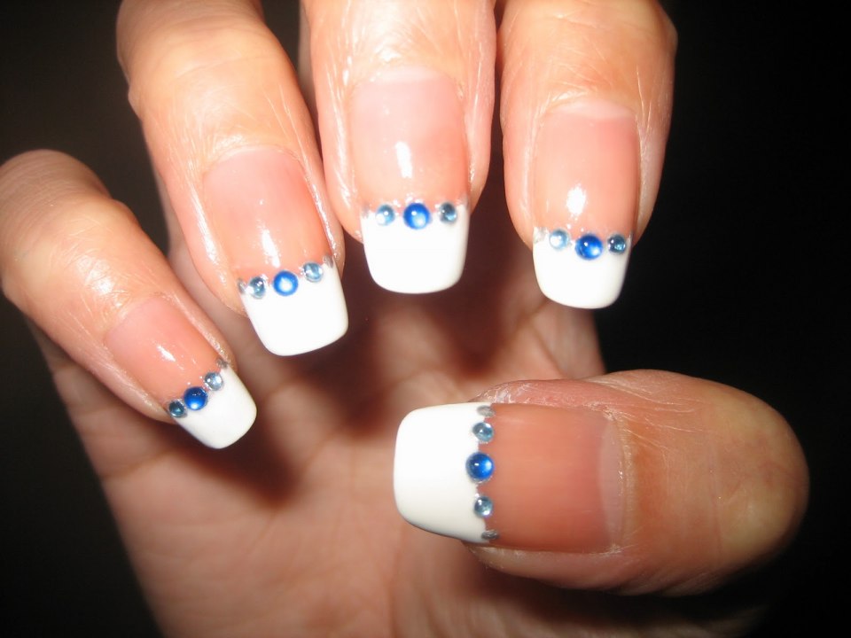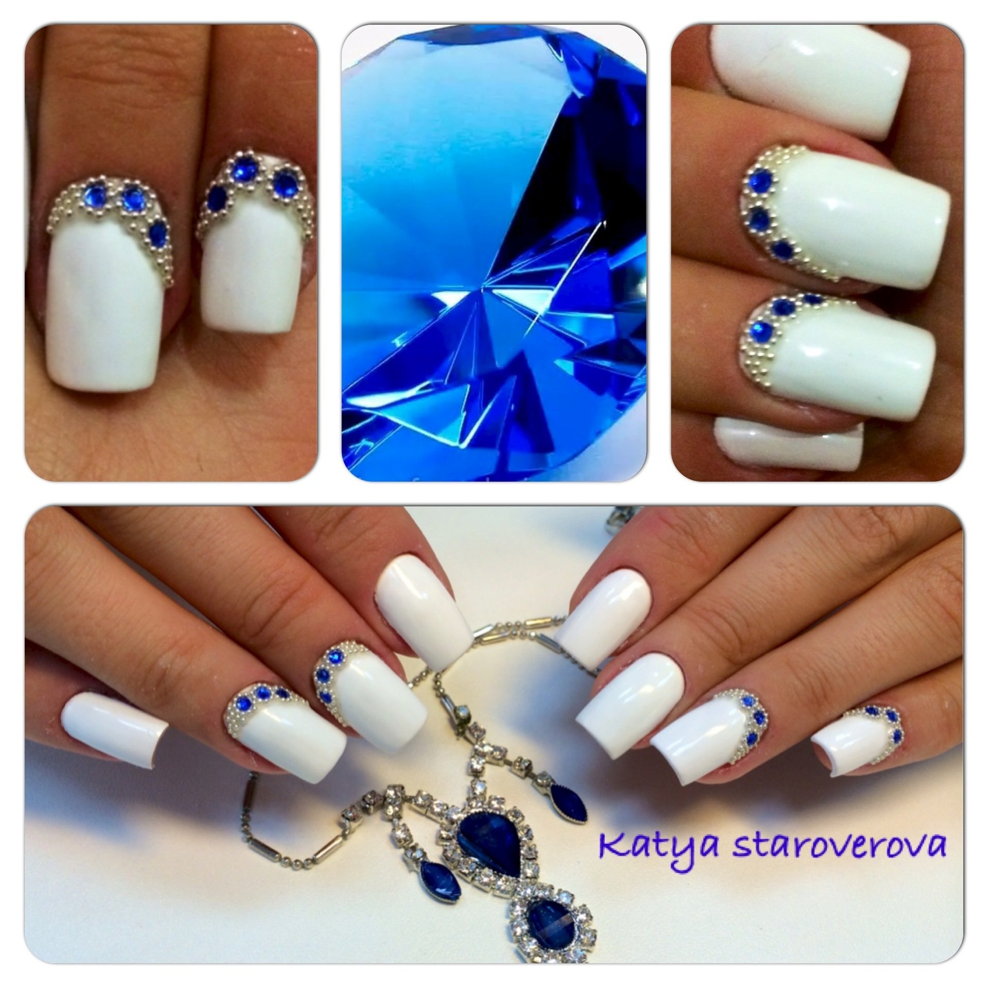 Белый френч с искусственными синими камнями на ногтях (60 фото)